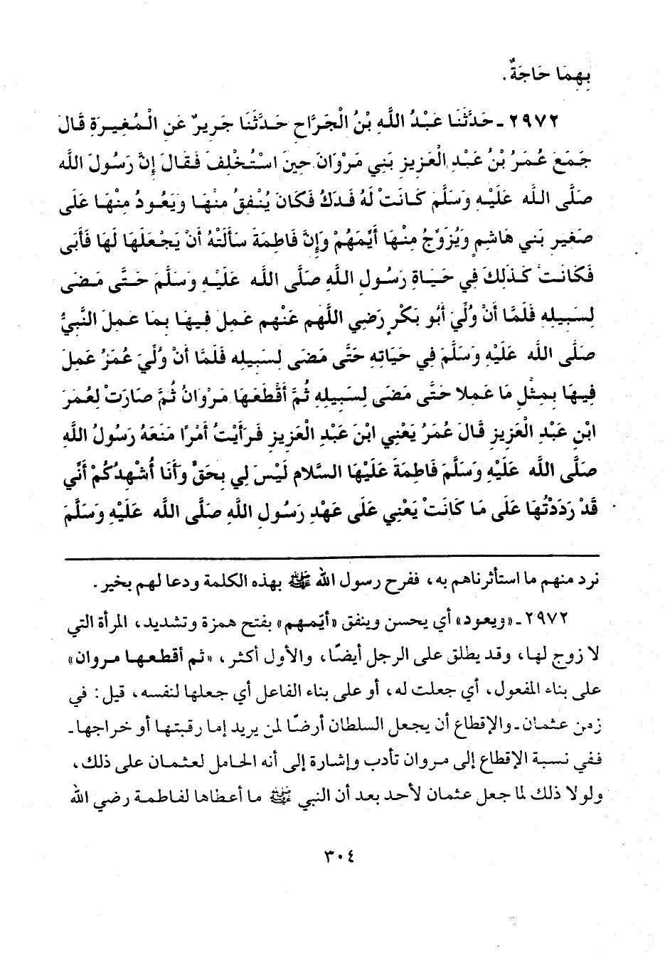2972 - حَدَّثَنَا عَبْدُ اللَّهِ بْنُ الْجَرَّاحِ، حَدَّثَنَا جَرِيرٌ، عَنِ الْمُغِيرَةِ، قَالَ: جَمَعَ عُمَرُ بْنُ عَبْدِ الْعَزِيزِ بَنِي مَرْوَانَ حِينَ اسْتُخْلِفَ، فَقَالَ: إِنَّ رَسُولَ اللَّهِ صَلَّى اللهُ عَلَيْهِ وَسَلَّمَ: «كَانَتْ لَهُ فَدَكُ، فَكَانَ يُنْفِقُ مِنْهَا وَيَعُودُ مِنْهَا عَلَى صَغِيرِ بَنِي هَاشِمٍ، وَيُزَوِّجُ مِنْهَا أَيِّمَهُمْ، وَإِنَّ فَاطِمَةَ سَأَلَتْهُ أَنْ يَجْعَلَهَا لَهَا فَأَبَى»، فَكَانَتْ كَذَلِكَ فِي حَيَاةِ رَسُولِ اللَّهِ صَلَّى اللهُ عَلَيْهِ وَسَلَّمَ، حَتَّى مَضَى لِسَبِيلِهِ، فَلَمَّا أَنْ وُلِّيَ أَبُو بَكْرٍ رَضِيَ اللَّهُ عَنْهُ، عَمِلَ فِيهَا بِمَا عَمِلَ النَّبِيُّ صَلَّى اللهُ عَلَيْهِ وَسَلَّمَ، فِي حَيَاتِهِ حَتَّى مَضَى لِسَبِيلِهِ، فَلَمَّا أَنْ وُلِّيَ عُمَرُ عَمِلَ فِيهَا بِمِثْلِ مَا عَمِلَا حَتَّى مَضَى لِسَبِيلِهِ، ثُمَّ أَقْطَعَهَا مَرْوَانُ، ثُمَّ صَارَتْ لِعُمَرَ بْنِ عَبْدِ الْعَزِيزِ، قَالَ عُمَرُ يَعْنِي ابْنَ عَبْدِ الْعَزِيزِ: فَرَأَيْتُ أَمْرًا مَنَعَهُ رَسُولُ اللَّهِ صَلَّى اللهُ عَلَيْهِ وَسَلَّمَ فَاطِمَةَ عَلَيْهَا السَّلَام، لَيْسَ لِي بِحَقٍّ، وَأَنَا أُشْهِدُكُمْ أَنِّي قَدْ رَدَدْتُهَا عَلَى مَا كَانَتْ يَعْنِي عَلَى عَهْدِ رَسُولِ اللَّهِ صَلَّى اللهُ عَلَيْهِ وَسَلَّمَ