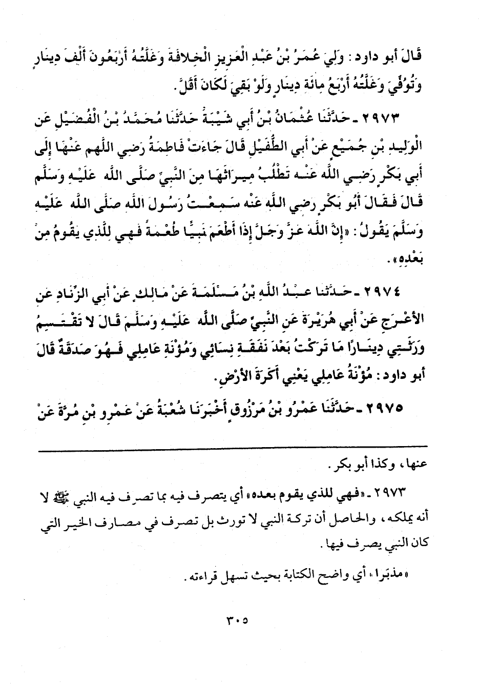 2974 - حَدَّثَنَا عَبْدُ اللَّهِ بْنُ مَسْلَمَةَ، عَنْ مَالِكٍ، عَنْ أَبِي الزِّنَادِ، عَنِ الْأَعْرَجِ، عَنْ أَبِي هُرَيْرَةَ، عَنِ النَّبِيِّ صَلَّى اللهُ عَلَيْهِ وَسَلَّمَ قَالَ: «لَا تَقْتَسِمُ وَرَثَتِي دِينَارًا، مَا تَرَكْتُ بَعْدَ نَفَقَةِ نِسَائِي، وَمُؤْنَةِ عَامِلِي فَهُوَ صَدَقَةٌ»، قَالَ أَبُو دَاوُدَ: مُؤْنَةُ عَامِلِي: يَعْنِي أَكَرَةَ الْأَرْضِ.
