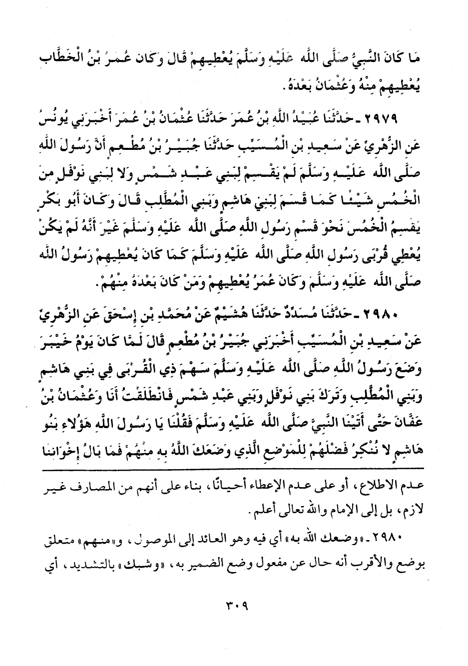 2980 - حَدَّثَنَا مُسَدِّدٌ، حَدَّثَنَا هُشَيْمٌ، عَنْ مُحَمَّدِ بْنِ إِسْحَاقَ، عَنِ الزُّهْرِيِّ، عَنْ سَعِيدِ بْنِ الْمُسَيِّبِ، أَخْبَرَنِي جُبَيْرُ بْنُ مُطْعِمٍ، قَالَ: لَمَّا كَانَ يَوْمُ خَيْبَرَ وَضَعَ رَسُولُ اللَّهِ صَلَّى اللهُ عَلَيْهِ وَسَلَّمَ سَهْمَ ذِي الْقُرْبَى فِي بَنِي هَاشِمٍ، وَبَنِي الْمُطَّلِبِ، وَتَرَكَ بَنِي نَوْفَلٍ، وَبَنِي عَبْدِ شَمْسٍ فَانْطَلَقْتُ أَنَا وَعُثْمَانُ بْنُ عَفَّانَ حَتَّى أَتَيْنَا النَّبِيَّ صَلَّى اللهُ عَلَيْهِ وَسَلَّمَ، فَقُلْنَا: يَا رَسُولَ اللَّهِ، هَؤُلَاءِ بَنُو هَاشِمٍ لَا نُنْكِرُ فَضْلَهُمْ لِلْمَوْضِعِ الَّذِي وَضَعَكَ اللَّهُ بِهِ مِنْهُمْ، فَمَا بَالُ إِخْوَانِنَا