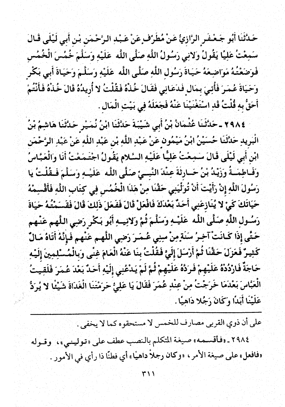 2984 - حَدَّثَنَا عُثْمَانُ بْنُ أَبِي شَيْبَةَ، حَدَّثَنَا ابْنُ نُمَيْرٍ، حَدَّثَنَا هَاشِمُ بْنُ الْبَرِيدِ، حَدَّثَنَا حُسَيْنُ بْنُ مَيْمُونٍ، عَنْ عَبْدِ اللَّهِ بْنِ عَبْدِ اللَّهِ، عَنْ عَبْدِ الرَّحْمَنِ بْنِ أَبِي لَيْلَى، قَالَ: سَمِعْتُ عَلِيًّا عَلَيْهِ السَّلَام، يَقُولُ: اجْتَمَعْتُ أَنَا وَالْعَبَّاسُ، وَفَاطِمَةُ، وَزَيْدُ بْنُ حَارِثَةَ، عِنْدَ النَّبِيِّ صَلَّى اللهُ عَلَيْهِ وَسَلَّمَ فَقُلْتُ: يَا رَسُولَ اللَّهِ، إِنْ رَأَيْتَ «أَنْ تُوَلِّيَنِي حَقَّنَا مِنْ هَذَا الْخُمُسِ فِي كِتَابِ اللَّهِ فَأَقْسِمْهُ حَيَاتَكَ كَيْ لَا يُنَازِعَنِي أَحَدٌ بَعْدَكَ»، فَافْعَلْ؟ قَالَ: فَفَعَلَ ذَلِكَ، قَالَ: فَقَسَمْتُهُ حَيَاةَ رَسُولِ اللَّهِ صَلَّى اللهُ عَلَيْهِ وَسَلَّمَ، ثُمَّ وَلَّانِيهِ أَبُو بَكْرٍ رَضِيَ اللَّهُ عَنْهُ حَتَّى إِذَا كَانَتْ آخِرُ سَنَةٍ مِنْ سِنِي عُمَرَ رَضِيَ اللَّهُ عَنْهُ، فَإِنَّهُ أَتَاهُ مَالٌ كَثِيرٌ فَعَزَلَ حَقَّنَا، ثُمَّ أَرْسَلَ إِلَيَّ فَقُلْتُ: بِنَا عَنْهُ الْعَامَ غِنًى وَبِالْمُسْلِمِينَ إِلَيْهِ حَاجَةٌ فَارْدُدْهُ عَلَيْهِمْ فَرَدَّهُ عَلَيْهِمْ، ثُمَّ لَمْ يَدْعُنِي إِلَيْهِ أَحَدٌ بَعْدَ عُمَرَ، فَلَقِيتُ الْعَبَّاسَ بَعْدَمَا خَرَجْتُ مِنْ عِنْدِ عُمَرَ، فَقَالَ: يَا عَلِيُّ، حَرَمْتَنَا الْغَدَاةَ شَيْئًا لَا يُرَدُّ عَلَيْنَا أَبَدًا، وَكَانَ رَجُلًا دَاهِيًا.
