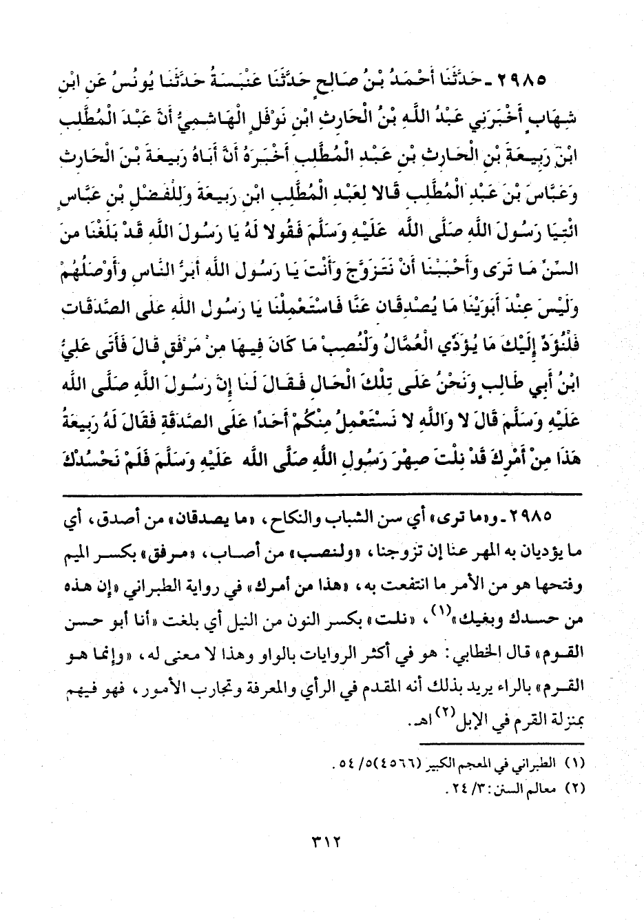 2985 - حَدَّثَنَا أَحْمَدُ بْنُ صَالِحٍ، حَدَّثَنَا عَنْبَسَةُ، حَدَّثَنَا يُونُسُ، عَنِ ابْنِ شِهَابٍ، أَخْبَرَنِي عَبْدُ اللَّهِ بْنُ الْحَارِثِ ابْنِ نَوْفَلٍ الْهَاشِمِيُّ، أَنَّ عَبْدَ الْمُطَّلِبِ بْنَ رَبِيعَةَ بْنِ الْحَارِثِ بْنِ عَبْدِ الْمُطَّلِبِ، أَخْبَرَهُ أَنَّ أَبَاهُ رَبِيعَةَ بْنَ الْحَارِثِ، وَعَبَّاسَ بْنَ عَبْدِ الْمُطَّلِبِ، قَالَا لِعَبْدِ الْمُطَّلِبِ بْنِ رَبِيعَةَ، وَلِلْفَضْلِ بْنِ عَبَّاسٍ: ائْتِيَا رَسُولَ اللَّهِ صَلَّى اللهُ عَلَيْهِ وَسَلَّمَ، فَقُولَا لَهُ: يَا رَسُولَ اللَّهِ، قَدْ بَلَغْنَا مِنَ السِّنِّ مَا تَرَى، وَأَحْبَبْنَا أَنْ نَتَزَوَّجَ وَأَنْتَ يَا رَسُولَ اللَّهِ، أَبَرُّ النَّاسِ، وَأَوْصَلُهُمْ، وَلَيْسَ عِنْدَ أَبَوَيْنَا مَا يُصْدِقَانِ عَنَّا، فَاسْتَعْمِلْنَا يَا رَسُولَ اللَّهِ عَلَى الصَّدَقَاتِ، فَلْنُؤَدِّ إِلَيْكَ مَا يُؤَدِّي الْعُمَّالُ، وَلْنُصِبْ مَا كَانَ فِيهَا مِنْ مَرْفَقٍ، قَالَ: فَأَتَى عَلِيُّ بْنُ أَبِي طَالِبٍ، وَنَحْنُ عَلَى تِلْكَ الْحَالِ، فَقَالَ لَنَا: رَسُولَ اللَّهِ صَلَّى اللهُ عَلَيْهِ وَسَلَّمَ، قَالَ: «لَا، وَاللَّهِ لَا نَسْتَعْمِلُ مِنْكُمْ أَحَدًا عَلَى الصَّدَقَةِ» فَقَالَ لَهُ رَبِيعَةُ، هَذَا مِنْ أَمْرِكَ قَدْ نِلْتَ صِهْرَ رَسُولِ اللَّهِ صَلَّى اللهُ عَلَيْهِ وَسَلَّمَ فَلَمْ نَحْسُدْكَ