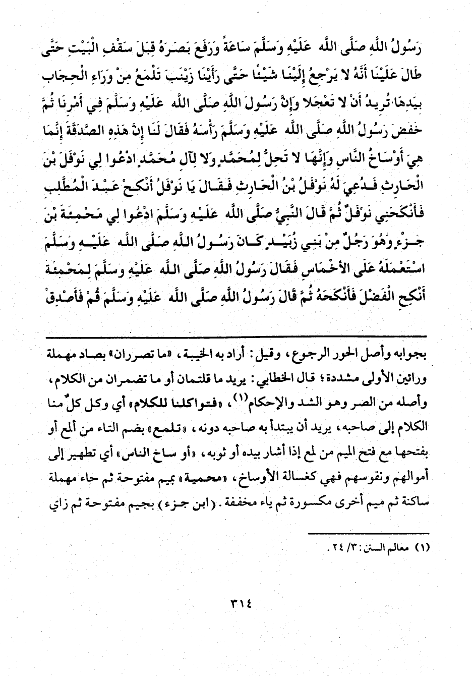 رَسُولُ اللَّهِ صَلَّى اللهُ عَلَيْهِ وَسَلَّمَ سَاعَةً، وَرَفَعَ بَصَرَهُ قِبَلَ سَقْفِ الْبَيْتِ، حَتَّى طَالَ عَلَيْنَا أَنَّهُ لَا يَرْجِعُ إِلَيْنَا شَيْئًا، حَتَّى رَأَيْنَا زَيْنَبَ تَلْمَعُ مِنْ وَرَاءِ الْحِجَابِ بِيَدِهَا، تُرِيدُ أَنْ لَا تَعْجَلَا، وَإِنَّ رَسُولَ اللَّهِ صَلَّى اللهُ عَلَيْهِ وَسَلَّمَ فِي أَمْرِنَا، ثُمَّ خَفَضَ رَسُولُ اللَّهِ صَلَّى اللهُ عَلَيْهِ وَسَلَّمَ رَأْسَهُ، فَقَالَ لَنَا: «إِنَّ هَذِهِ الصَّدَقَةَ، إِنَّمَا هِيَ أَوْسَاخُ النَّاسِ، وَإِنَّهَا لَا تَحِلُّ لِمُحَمَّدٍ، وَلَا لِآلِ مُحَمَّدٍ، ادْعُوا لِي نَوْفَلَ بْنَ الْحَارِثِ»، فَدُعِيَ لَهُ نَوْفَلُ بْنُ الْحَارِثِ، فَقَالَ: «يَا نَوْفَلُ، أَنْكِحْ عَبْدَ الْمُطَّلِبِ»، فَأَنْكَحَنِي نَوْفَلٌ، ثُمَّ قَالَ النَّبِيُّ صَلَّى اللهُ عَلَيْهِ وَسَلَّمَ: «ادْعُوا لِي مَحْمِئَةَ بْنَ جَزْءٍ» وَهُوَ رَجُلٌ مِنْ بَنِي زُبَيْدٍ كَانَ رَسُولُ اللَّهِ صَلَّى اللهُ عَلَيْهِ وَسَلَّمَ اسْتَعْمَلَهُ عَلَى الْأَخْمَاسِ، فَقَالَ رَسُولُ اللَّهِ صَلَّى اللهُ عَلَيْهِ وَسَلَّمَ لِمَحْمِئَةَ: «أَنْكِحْ الْفَضْلَ» فَأَنْكَحَهُ، ثُمَّ قَالَ رَسُولُ اللَّهِ صَلَّى اللهُ عَلَيْهِ وَسَلَّمَ: «قُمْ فَأَصْدِقْ