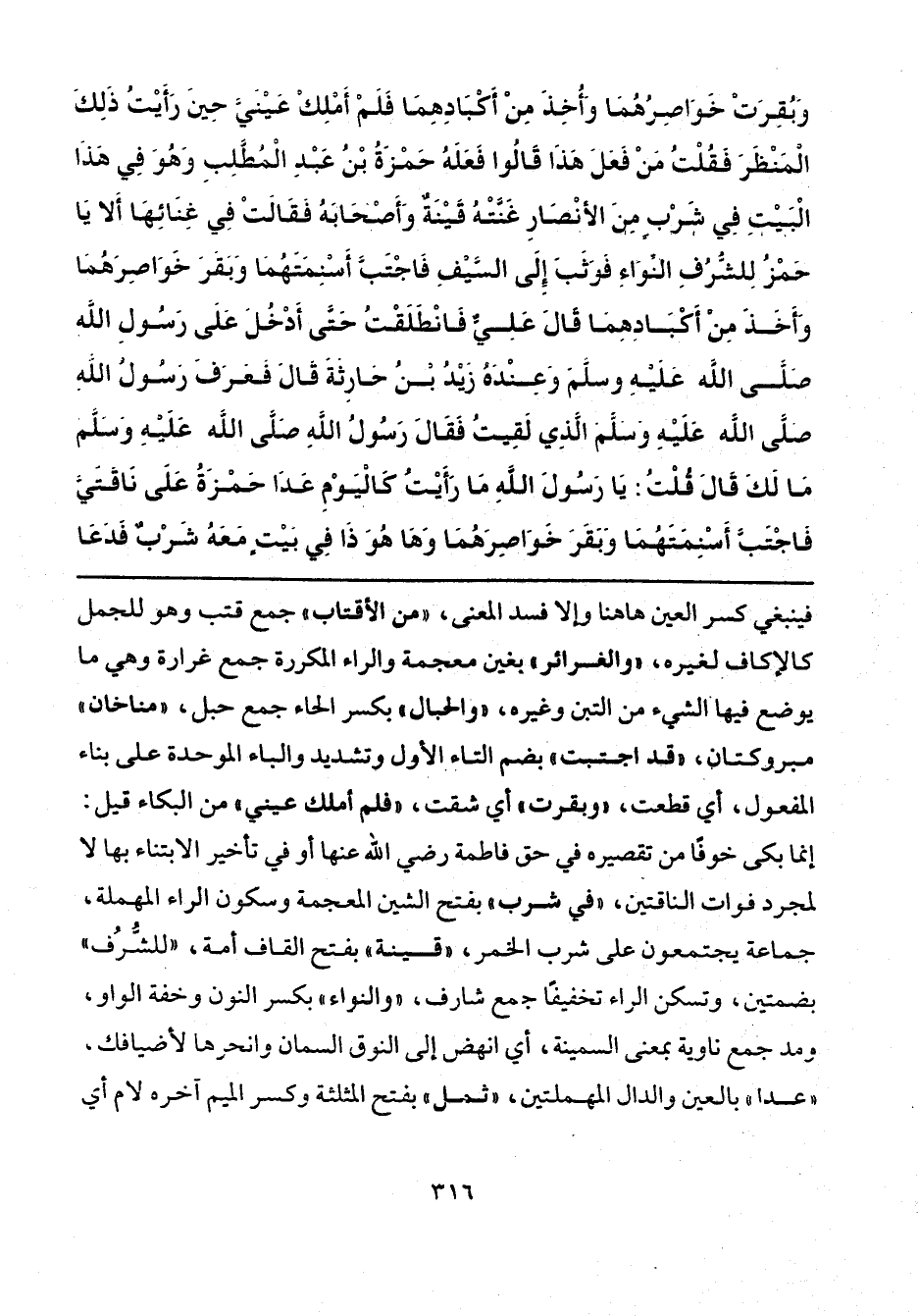 وَبُقِرَتْ خَوَاصِرُهُمَا، وَأُخِذَ مِنْ أَكْبَادِهِمَا فَلَمْ أَمْلِكْ عَيْنَيَّ حِينَ رَأَيْتُ ذَلِكَ الْمَنْظَرَ، فَقُلْتُ: مَنْ فَعَلَ هَذَا؟ قَالُوا: فَعَلَهُ حَمْزَةُ بْنُ عَبْدِ الْمُطَّلِبِ، وَهُوَ فِي هَذَا الْبَيْتِ فِي شَرْبٍ مِنَ الْأَنْصَارِ غَنَّتْهُ قَيْنَةٌ وَأَصْحَابَهُ، فَقَالَتْ: فِي غِنَائِهَا: أَلَا يَا حَمْزُ لِلشُّرُفِ النِّوَاءِ فَوَثَبَ إِلَى السَّيْفِ فَاجْتَبَّ أَسْنِمَتَهُمَا، وَبَقَرَ خَوَاصِرَهُمَا وَأَخَذَ مِنْ أَكْبَادِهِمَا، قَالَ عَلِيٌّ: فَانْطَلَقْتُ حَتَّى أَدْخُلَ عَلَى رَسُولِ اللَّهِ صَلَّى اللهُ عَلَيْهِ وَسَلَّمَ، وَعِنْدَهُ زَيْدُ بْنُ حَارِثَةَ، قَالَ: فَعَرَفَ رَسُولُ اللَّهِ صَلَّى اللهُ عَلَيْهِ وَسَلَّمَ الَّذِي لَقِيتُ، فَقَالَ رَسُولُ اللَّهِ صَلَّى اللهُ عَلَيْهِ وَسَلَّمَ: «مَا لَكَ؟ » قَالَ: قُلْتُ: يَا رَسُولَ اللَّهِ، مَا رَأَيْتُ كَالْيَوْمِ، عَدَا حَمْزَةُ عَلَى نَاقَتَيَّ، فَاجْتَبَّ أَسْنِمَتَهُمَا، وَبَقَرَ خَوَاصِرَهُمَا، وَهَا هُوَ ذَا فِي بَيْتٍ مَعَهُ شَرْبٌ، فَدَعَا