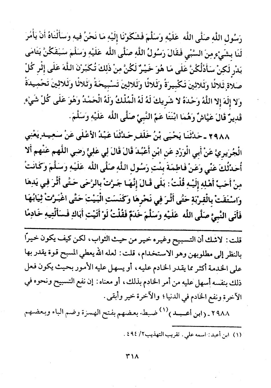 2988 - حَدَّثَنَا يَحْيَى بْنُ خَلَفٍ، حَدَّثَنَا عَبْدُ الْأَعْلَى، عَنْ سَعِيدٍ يَعْنِي الْجُرَيرِيَّ، عَنْ أَبِي الْوَرْدِ، عَنِ ابْنِ أَعْبُدَ، قَالَ: قَالَ لِي عَلِيٌّ رَضِيَ اللَّهُ عَنْهُ: أَلَا أُحَدِّثُكَ عَنِّي، وَعَنْ فَاطِمَةَ بِنْتِ رَسُولِ اللَّهِ صَلَّى اللهُ عَلَيْهِ وَسَلَّمَ، وَكَانَتْ مِنْ أَحَبِّ أَهْلِهِ إِلَيْهِ؟ قُلْتُ: بَلَى، قَالَ: إِنَّهَا جَرَّتْ بِالرَّحَى حَتَّى أَثَّرَ فِي يَدِهَا، وَاسْتَقَتْ بِالْقِرْبَةِ حَتَّى أَثَّرَ فِي نَحْرِهَا، وَكَنَسَتِ الْبَيْتَ حَتَّى اغْبَرَّتْ ثِيَابُهَا، فَأَتَى النَّبِيَّ صَلَّى اللهُ عَلَيْهِ وَسَلَّمَ خَدَمٌ، فَقُلْتُ: لَوْ أَتَيْتِ أَبَاكِ فَسَأَلْتِيهِ خَادِمًا،