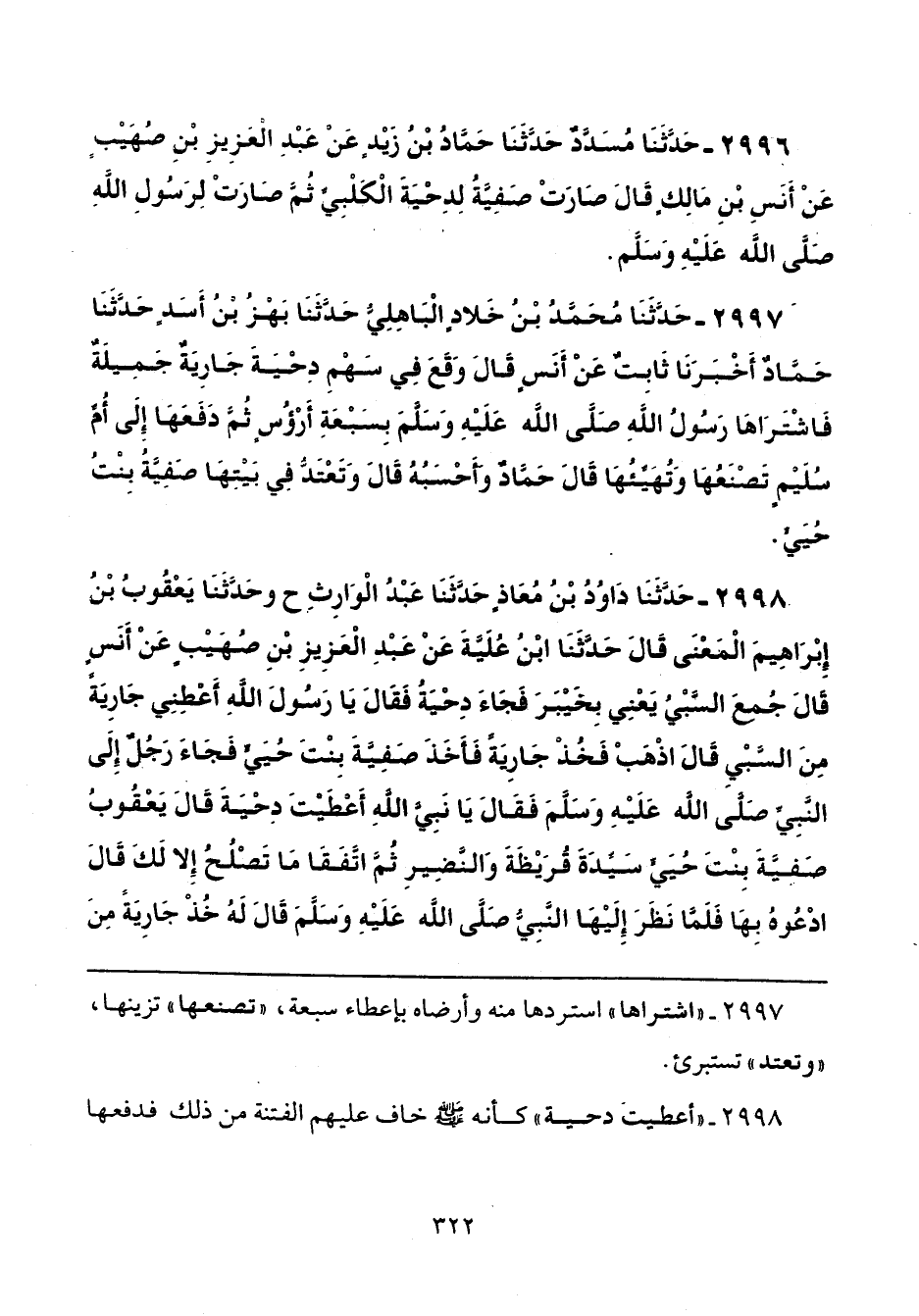 2996 - حَدَّثَنَا مُسَدَّدٌ، حَدَّثَنَا حَمَّادُ بْنُ زَيْدٍ، عَنْ عَبْدِ الْعَزِيزِ بْنِ صُهَيْبٍ، عَنْ أَنَسِ بْنِ مَالِكٍ، قَالَ: «صَارَتْ صَفِيَّةُ لِدِحْيَةَ الْكَلْبِيِّ، ثُمَّ صَارَتْ لِرَسُولِ اللَّهِ صَلَّى اللهُ عَلَيْهِ وَسَلَّمَ».