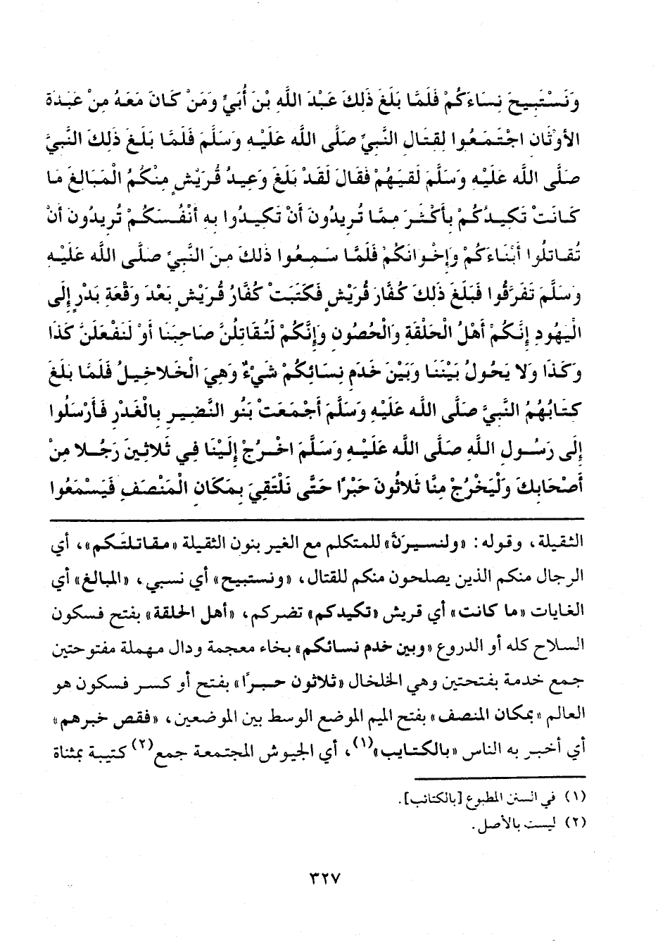 وَنَسْتَبِيحَ نِسَاءَكُمْ، فَلَمَّا بَلَغَ ذَلِكَ عَبْدَ اللَّهِ بْنَ أُبَيٍّ وَمَنْ كَانَ مَعَهُ مِنْ عَبَدَةِ الْأَوْثَانِ، اجْتَمَعُوا لِقِتَالِ النَّبِيِّ صَلَّى اللهُ عَلَيْهِ وَسَلَّمَ، فَلَمَّا بَلَغَ ذَلِكَ النَّبِيَّ صَلَّى اللهُ عَلَيْهِ وَسَلَّمَ لَقِيَهُمْ، فَقَالَ: «لَقَدْ بَلَغَ وَعِيدُ قُرَيْشٍ مِنْكُمُ الْمَبَالِغَ، مَا كَانَتْ تَكِيدُكُمْ بِأَكْثَرَ مِمَّا تُرِيدُونَ أَنْ تَكِيدُوا بِهِ أَنْفُسَكُمْ، تُرِيدُونَ أَنْ تُقَاتِلُوا أَبْنَاءَكُمْ، وَإِخْوَانَكُمْ» فَلَمَّا سَمِعُوا ذَلِكَ مِنَ النَّبِيِّ صَلَّى اللهُ عَلَيْهِ وَسَلَّمَ تَفَرَّقُوا، فَبَلَغَ ذَلِكَ كُفَّارَ قُرَيْشٍ، فَكَتَبَتْ كُفَّارُ قُرَيْشٍ بَعْدَ وَقْعَةِ بَدْرٍ إِلَى الْيَهُودِ: إِنَّكُمْ أَهْلُ الْحَلْقَةِ وَالْحُصُونِ، وَإِنَّكُمْ لَتُقَاتِلُنَّ صَاحِبَنَا، أَوْ لَنَفْعَلَنَّ كَذَا وَكَذَا، وَلَا يَحُولُ بَيْنَنَا وَبَيْنَ خَدَمِ نِسَائِكُمْ شَيْءٌ، وَهِيَ الْخَلَاخِيلُ، فَلَمَّا بَلَغَ كِتَابُهُمُ النَّبِيَّ صَلَّى اللهُ عَلَيْهِ وَسَلَّمَ، أَجْمَعَتْ بَنُو النَّضِيرِ بِالْغَدْرِ، فَأَرْسَلُوا إِلَى رَسُولِ اللَّهِ صَلَّى اللهُ عَلَيْهِ وَسَلَّمَ: اخْرُجْ إِلَيْنَا فِي ثَلَاثِينَ رَجُلًا مِنْ أَصْحَابِكَ، وَلْيَخْرُجْ مِنَّا ثَلَاثُونَ حَبْرًا، حَتَّى نَلْتَقِيَ بِمَكَانِ الْمَنْصَفِ فَيَسْمَعُوا