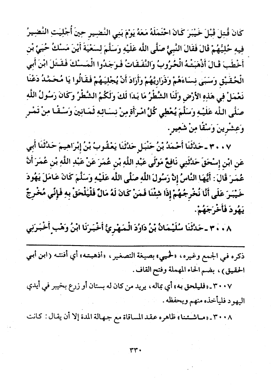 3007 - حَدَّثَنَا أَحْمَدُ بْنُ حَنْبَلٍ، حَدَّثَنَا يَعْقُوبُ بْنُ إِبْرَاهِيمَ، حَدَّثَنَا أَبِي، عَنِ ابْنِ إِسْحَاقَ، حَدَّثَنِي نَافِعٌ، مَوْلَى عَبْدِ اللَّهِ بْنِ عُمَرَ، عَنْ عَبْدِ اللَّهِ بْنِ عُمَرَ، أَنَّ عُمَرَ، قَالَ: أَيُّهَا النَّاسُ، إِنَّ رَسُولَ اللَّهِ صَلَّى اللهُ عَلَيْهِ وَسَلَّمَ «كَانَ عَامَلَ يَهُودَ خَيْبَرَ عَلَى أَنَّا نُخْرِجُهُمْ إِذَا شِئْنَا، فَمَنْ كَانَ لَهُ مَالٌ فَلْيَلْحَقْ بِهِ، فَإِنِّي مُخْرِجٌ يَهُودَ»، فَأَخْرَجَهُمْ.