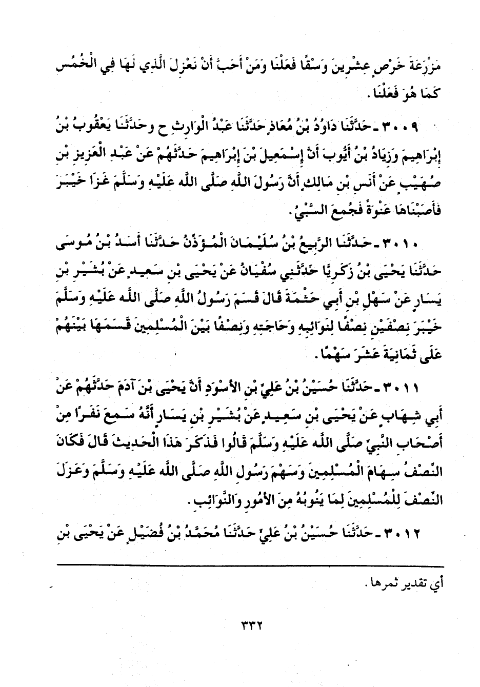 3011 - حَدَّثَنَا حُسَيْنُ بْنُ عَلِيِّ بْنِ الْأَسْوَدِ، أَنَّ يَحْيَى بْنَ آدَمَ، حَدَّثَهُمْ عَنْ أَبِي شِهَابٍ، عَنْ يَحْيَى بْنِ سَعِيدٍ، عَنْ بُشَيْرِ بْنِ يَسَارٍ، أَنَّهُ سَمِعَ نَفَرًا مِنْ أَصْحَابِ النَّبِيِّ صَلَّى اللهُ عَلَيْهِ وَسَلَّمَ، قَالُوا: فَذَكَرَ هَذَا الْحَدِيثَ، قَالَ: فَكَانَ النِّصْفُ سِهَامَ الْمُسْلِمِينَ، وَسَهْمَ رَسُولِ اللَّهِ صَلَّى اللهُ عَلَيْهِ وَسَلَّمَ، وَعَزَلَ النِّصْفَ لِلْمُسْلِمِينَ لِمَا يَنُوبُهُ مِنَ الْأُمُورِ وَالنَّوَائِبِ.