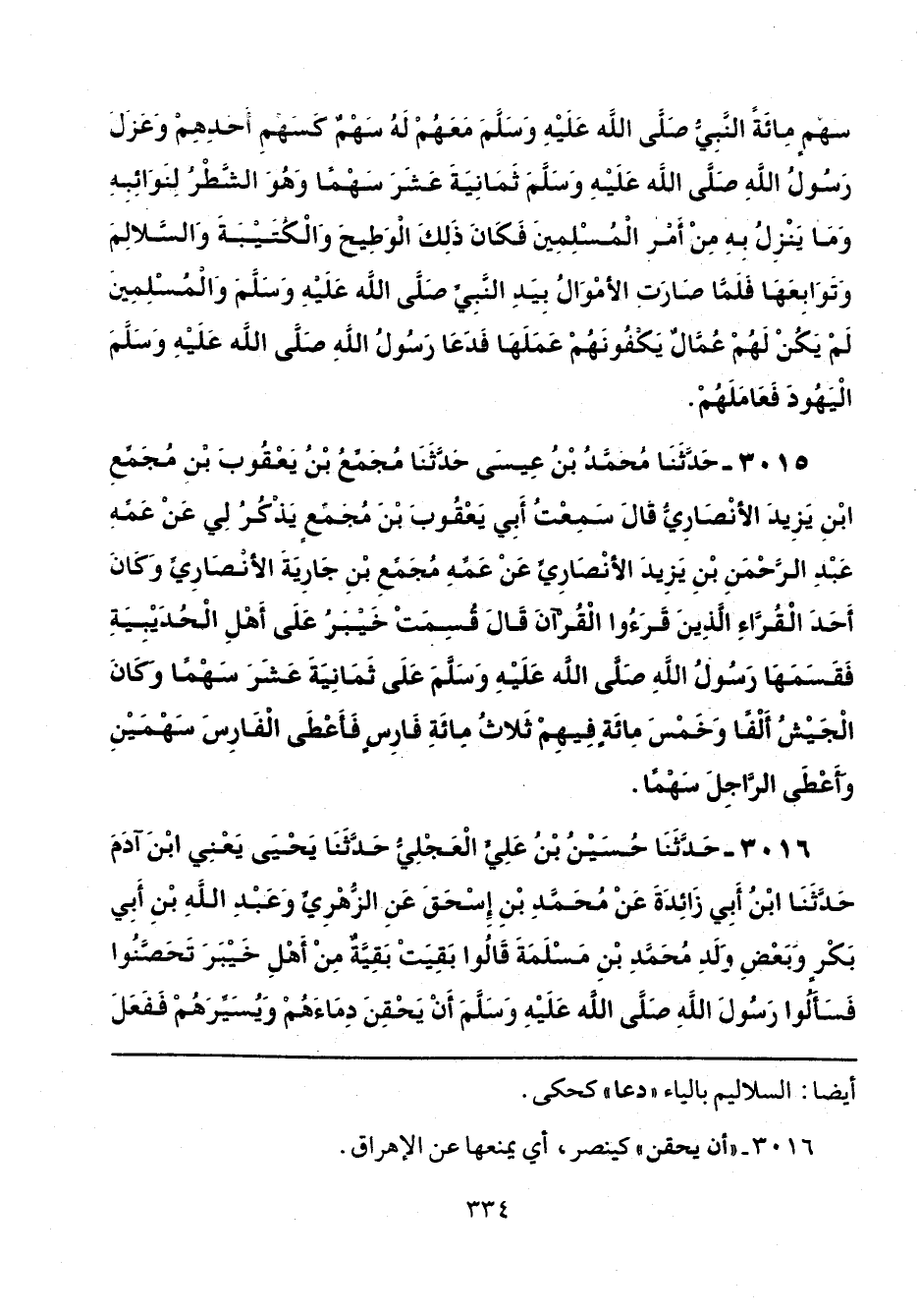 3015 - حَدَّثَنَا مُحَمَّدُ بْنُ عِيسَى، حَدَّثَنَا مُجَمِّعُ بْنُ يَعْقُوبَ بْنِ مُجَمِّعِ بْنِ يَزِيدَ الْأَنْصَارِيُّ، قَالَ: سَمِعْتُ أَبِي يَعْقُوبَ بْنَ مُجَمِّعٍ، يَذْكُرُ لِي عَنْ عَمِّهِ عَبْدِ الرَّحْمَنِ بْنِ يَزِيدَ الْأَنْصَارِيِّ، عَنْ عَمِّهِ مُجَمِّعِ بْنِ جَارِيَةَ الْأَنْصَارِيِّ - وَكَانَ أَحَدَ الْقُرَّاءِ الَّذِينَ قَرَءُوا الْقُرْآنَ، قَالَ: «قُسِمَتْ خَيْبَرُ عَلَى أَهْلِ الْحُدَيْبِيَةِ، فَقَسَمَهَا رَسُولُ اللَّهِ صلّى الله عليه وسلم عَلَى ثَمَانِيَةَ عَشَرَ سَهْمًا، وَكَانَ الْجَيْشُ أَلْفًا وَخَمْسَ مِائَةٍ، فِيهِمْ ثَلَاثُ مِائَةِ فَارِسٍ، فَأَعْطَى الْفَارِسَ سَهْمَيْنِ، وَأَعْطَى الرَّاجِلَ سَهْمًا».
