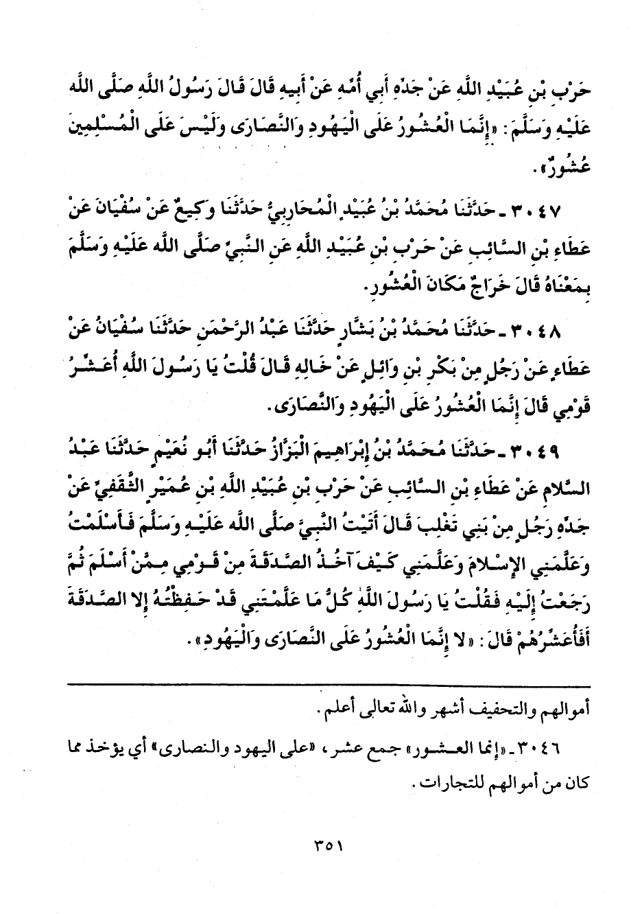 3046 - "إِنما العشور" جمع عشر، "على اليهود والنصارى" أي يؤخذ مما كان من أموالهم للتجارات.