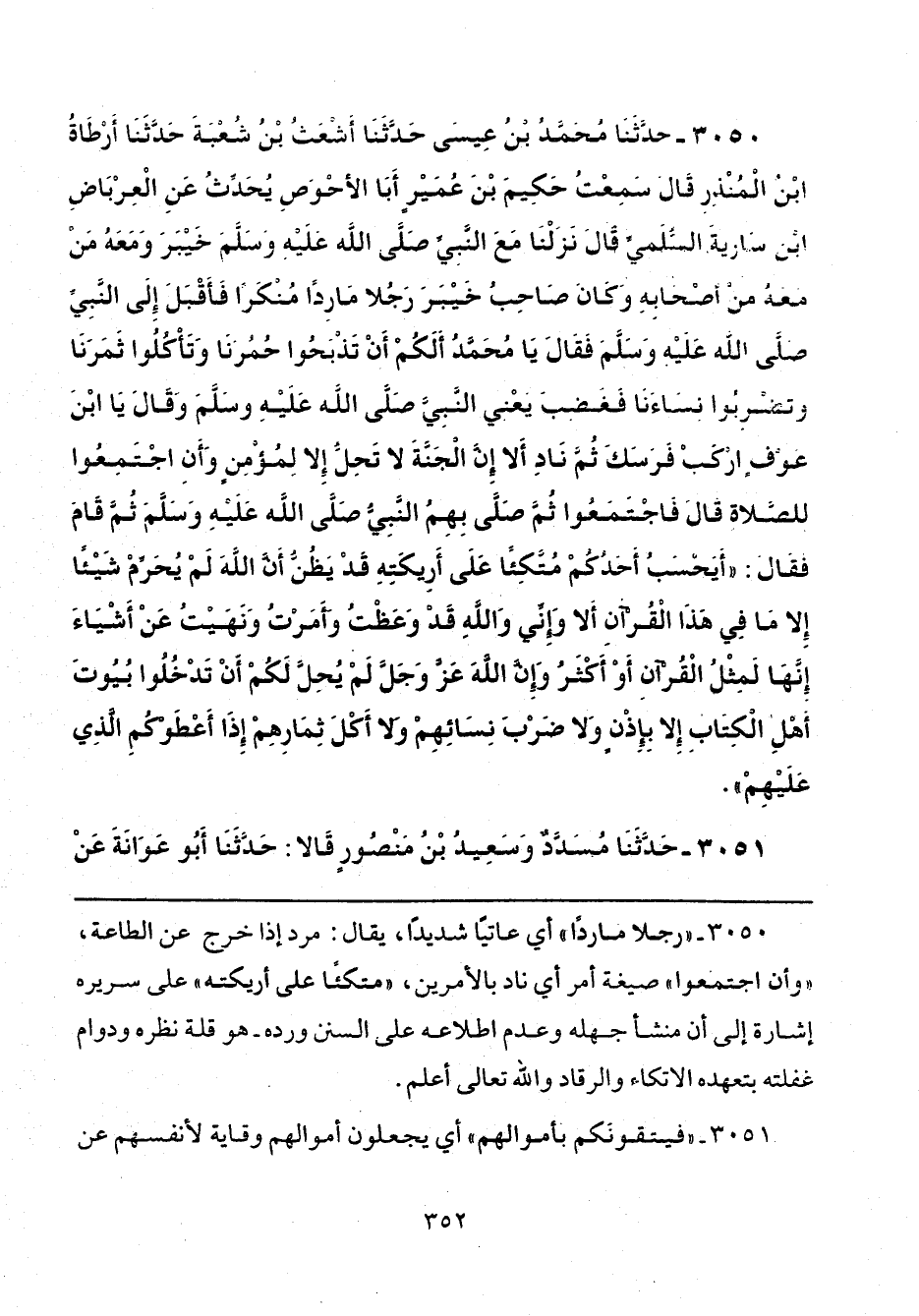3050 - حَدَّثَنَا مُحَمَّدُ بْنُ عِيسَى، حَدَّثَنَا أَشْعَثُ بْنُ شُعْبَةَ، حَدَّثَنَا أَرْطَاةُ بْنُ الْمُنْذِرِ، قَالَ: سَمِعْتُ حَكِيمَ بْنَ عُمَيْرٍ أَبَا الْأَحْوَصِ يُحَدِّثُ، عَنِ الْعِرْبَاضِ بْنِ سَارِيَةَ السُّلَمِيِّ، قَالَ: نَزَلْنَا مَعَ النَّبِيِّ صَلَّى اللهُ عَلَيْهِ وَسَلَّمَ خَيْبَرَ وَمَعَهُ مَنْ مَعَهُ مِنْ أَصْحَابِهِ، وَكَانَ صَاحِبُ خَيْبَرَ رَجُلًا مَارِدًا مُنْكَرًا، فَأَقْبَلَ إِلَى النَّبِيِّ صَلَّى اللهُ عَلَيْهِ وَسَلَّمَ، فَقَالَ: يَا مُحَمَّدُ، أَلَكُمْ أَنْ تَذْبَحُوا حُمُرَنَا، وَتَأْكُلُوا ثَمَرَنَا، وَتَضْرِبُوا نِسَاءَنَا، فَغَضِبَ - يَعْنِي النَّبِيَّ صَلَّى اللهُ عَلَيْهِ وَسَلَّمَ - وَقَالَ: " يَا ابْنَ عَوْفٍ ارْكَبْ فَرَسَكَ ثُمَّ نَادِ: أَلَا إِنَّ الْجَنَّةَ لَا تَحِلُّ إِلَّا لِمُؤْمِنٍ، وَأَنِ اجْتَمِعُوا لِلصَّلَاةِ "، قَالَ: فَاجْتَمَعُوا، ثُمَّ صَلَّى بِهِمُ النَّبِيُّ صَلَّى اللهُ عَلَيْهِ وَسَلَّمَ، ثُمَّ قَامَ، فَقَالَ: «أَيَحْسَبُ أَحَدُكُمْ مُتَّكِئًا عَلَى أَرِيكَتِهِ، قَدْ يَظُنُّ أَنَّ اللَّهَ لَمْ يُحَرِّمْ شَيْئًا إِلَّا مَا فِي هَذَا الْقُرْآنِ، أَلَا وَإِنِّي وَاللَّهِ قَدْ وَعَظْتُ، وَأَمَرْتُ، وَنَهَيْتُ، عَنْ أَشْيَاءَ إِنَّهَا لَمِثْلُ الْقُرْآنِ، أَوْ أَكْثَرُ، وَإِنَّ اللَّهَ عَزَّ وَجَلَّ لَمْ يُحِلَّ لَكُمْ أَنْ تَدْخُلُوا بُيُوتَ أَهْلِ الْكِتَابِ إِلَّا بِإِذْنٍ، وَلَا ضَرْبَ نِسَائِهِمْ، وَلَا أَكْلَ ثِمَارِهِمْ، إِذَا أَعْطَوْكُمُ الَّذِي عَلَيْهِمْ».