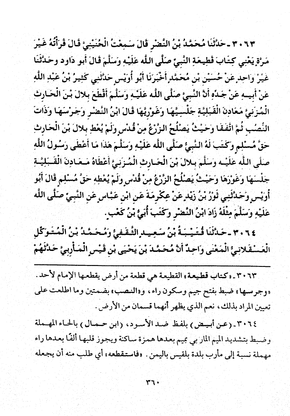 3063 - "كتاب قطيعة" القطيعة هي قطعة من أرض يقطعها الإمام لأحد. "وجرسها" ضبط بفتح جيم وسكون راء، و"النصب" بضمتين وما اطلعت على تعيين المراد بذلك، نعم الذي يظهر أنهما قسمان من الأرض.