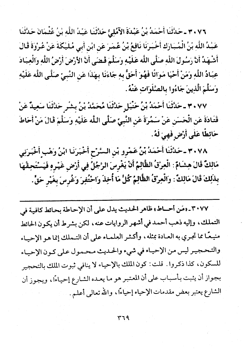 3077 - "مَن أحاط" ظاهر الحديث يدل على أن الإحاطة بحائط كافية في التملك، وإليه ذهب أحمد في أشهر الروايات عنه، لكن بشرط أن يكون الحائط منيعًا مما تحري به العادة بمثله، وأكثر العلماء على أن التملك إنما هو الإحياء والتحجير ليس من الإحياء في شيء والحديث محمول على كون الإحياء للسكون، كذا ذكروا. قلت: كون الملك بالإحياء لا ينافي ثبوت الملك بالتحجير بجواز أن يثبت بأسباب على أن المعتبر هو ما يعده الشارع إحياءًا، ويجوز أن الشارع يعتبر بعض مقدمات الإحياء إحياءًا، والله تعالى أعلم.