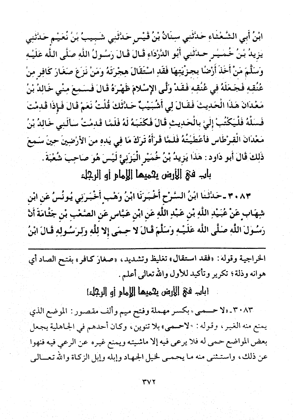 3083 - "لا حمى" بكسر مهملة وفتح ميم وألف مقصور: الموضع الذي يمنع منه الغير، وقوله: "لا حمى" بلا تنوين، وكات أحدهم في الجاهلية يجعل بعض المواضع حمى له فلا يرعى فيه إلا ماشيته ويمنع غيره عن الرعي فيه فنهوا في ذلك، واستثنى منه ما يحمى لخيل الجهاد وإبله الزكاة والله تعالى