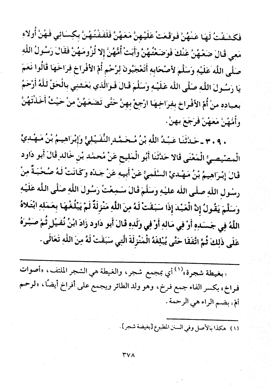 "بغيطة شجرة" (¬1) أي بمجمع شجر، والغيطة هي الشجر الملتف، "أصوات فراخ"، بكسر الفاء جمع فرخ، وهو ولد الطائر ويجمع على أفراخ أيضًا، "لرحم أمّ" بضم الراء هي الرحمة.