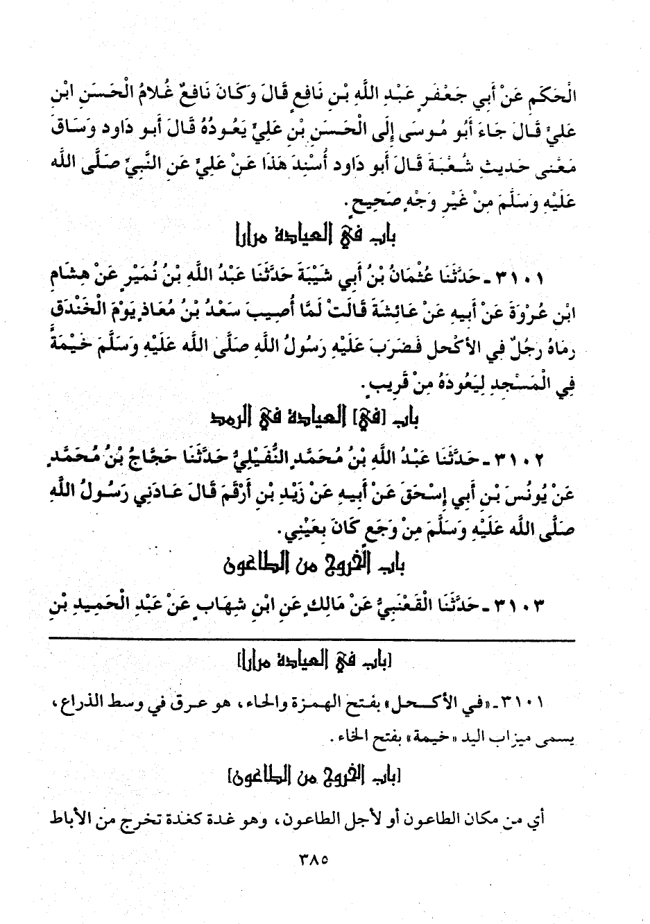 3101 - حَدَّثَنَا عُثْمَانُ بْنُ أَبِي شَيْبَةَ، حَدَّثَنَا عَبْدُ اللَّهِ بْنُ نُمَيْرٍ، عَنْ هِشَامِ بْنِ عُرْوَةَ، عَنْ أَبِيهِ، عَنْ عَائِشَةَ، قَالَتْ: «لَمَّا أُصِيبَ سَعْدُ بْنُ مُعَاذٍ يَوْمَ الْخَنْدَقِ، رَمَاهُ رَجُلٌ فِي الْأَكْحَلِ فَضَرَبَ عَلَيْهِ رَسُولُ اللَّهِ صَلَّى اللهُ عَلَيْهِ وَسَلَّمَ خَيْمَةً فِي الْمَسْجِدِ لِيَعُودَهُ مِنْ قَرِيبٍ».