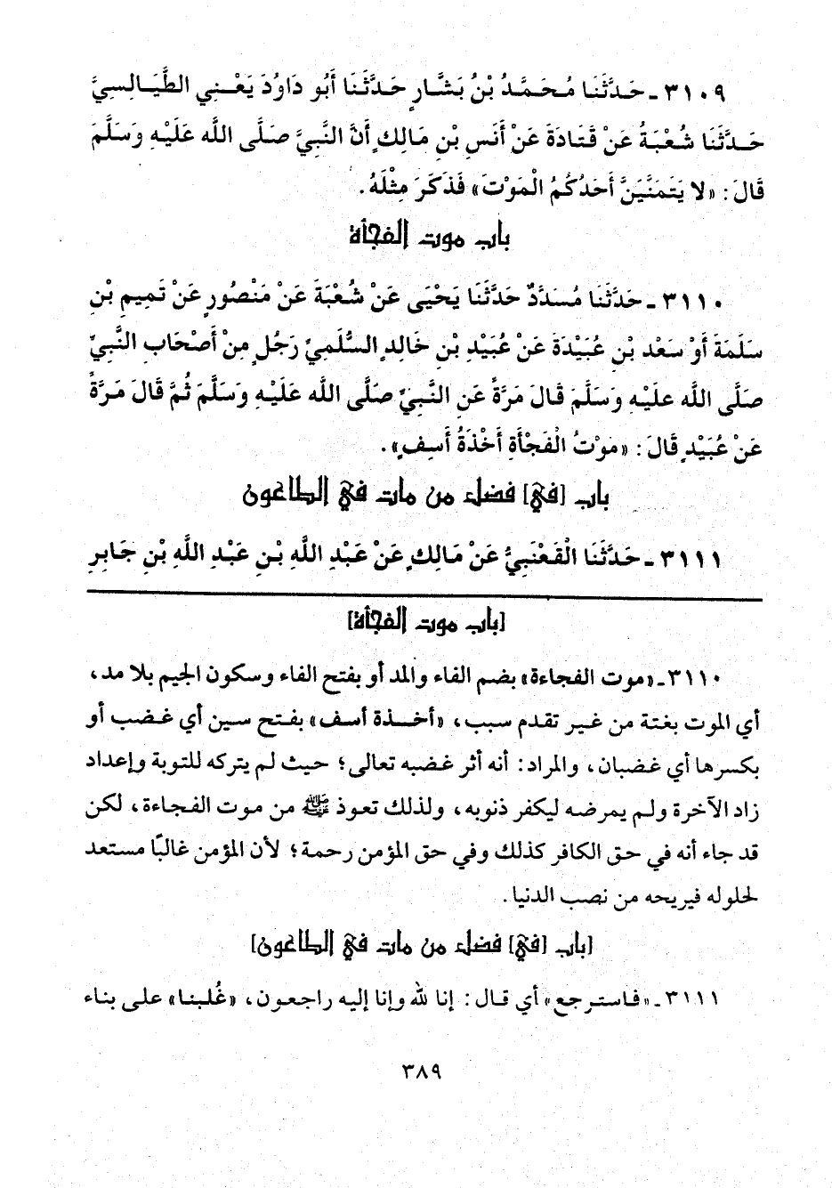 3110 - "موت الفجاءة" بضم الفاء والمد أو بفتح الفاء وسكون الجيم بلا مد، أي الموت بغتة من غير تقدم سبب، "أخذة أسف" بفتح سين أي غضب أو بكسرها أي غضبان، والمراد: أنه أثر غضبه تعالى؛ حيث لم يتركه للتوبة وإعداد زاد الآخرة ولم يمرضه ليكفر ذنوبه، ولذلك تعوذ - صلى الله عليه وسلم - من موت الفجاءة، لكن قد جاء أنه في حق الكافر كذلك وفي حق المؤمن رحمة؛ لأن المؤمن غالبًا مستعد لحلوله فيريحه من نصب الدنيا.