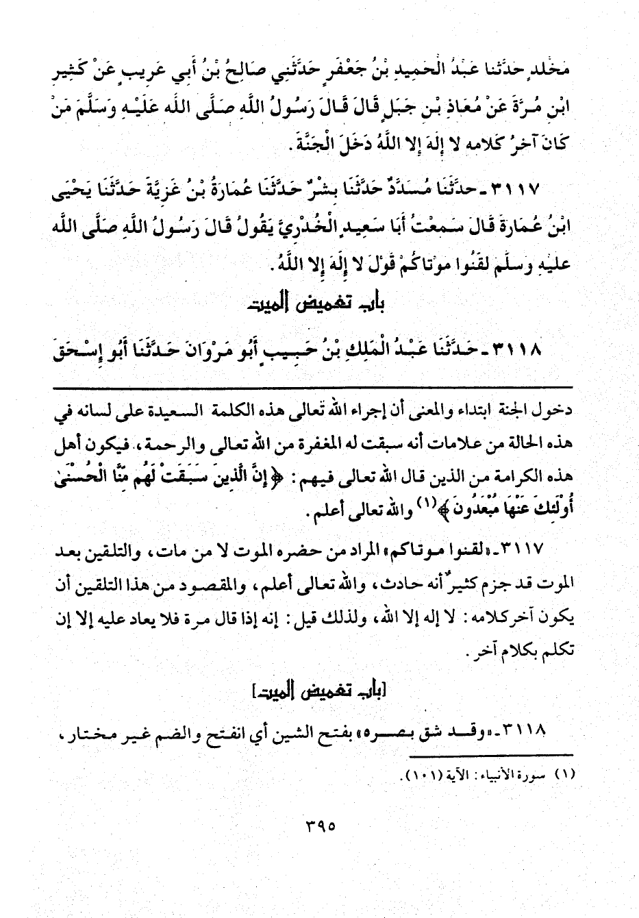 3117 - "لقنوا موتاكم" المراد من حضره الموت لا من مات، والتلقين بعد الموت قد جزم كثيرٌ أنه حادث، والله تعالى أعلم، والمقصود من هذا التلقين أن يكون آخر كلامه: لا إله إلا الله، ولذلك قيل: إنه إذا قال مرة فلا يعاد عليه إلا إن تكلم بكلام آخر.