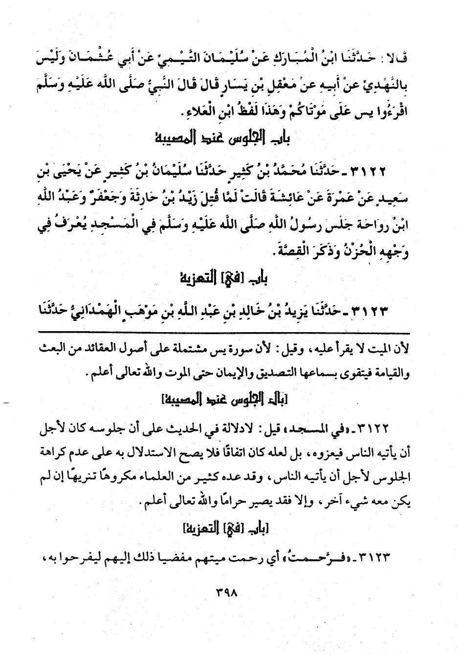 3122 - "في المسجد" قيل: لا دلالة في الحديث على أن جلوسه كان لأجل أن يأتيه الناس فيعزوه، بل لعله كان اتفاقًا فلا يصح الاستدلال به على عدم كراهة الجلوس لأجل أن يأتيه الناس، وقد عده كثير من العلماء مكروهًا تنزيهًا إن لم يكن معه شيء آخر، وإلا فقد يصير حرامًا والله تعالى أعلم.