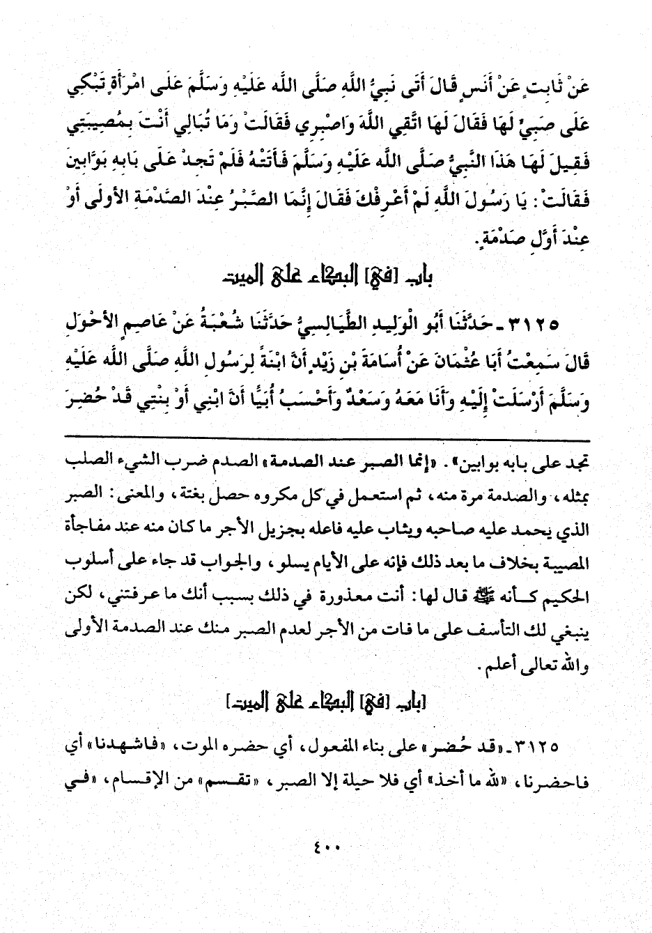 3125 - حَدَّثَنَا أَبُو الْوَلِيدِ الطَّيَالِسِيُّ، حَدَّثَنَا شُعْبَةُ، عَنْ عَاصِمٍ الْأَحْوَلِ، قَالَ: سَمِعْتُ أَبَا عُثْمَانَ، عَنْ أُسَامَةَ بْنِ زَيْدٍ، أَنَّ ابْنَةً لِرَسُولِ اللَّهِ صَلَّى اللهُ عَلَيْهِ وَسَلَّمَ أَرْسَلَتْ إِلَيْهِ وَأَنَا مَعَهُ، وَسَعْدٌ، وَأَحْسَبُ أُبَيًّا: أَنَّ ابْنِي - أَوْ بِنْتِي - قَدْ حُضِرَ