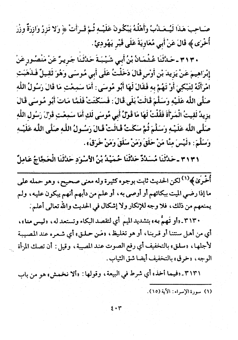 3130 - "أو تَهمُّ به" بتشديد الميم أي لتقصد البكاء وتستعد له، "ليس منا"، أي من أهل سنتنا أو قربنا، أو هو تغليظ، "من حلق" أي شعره عند المصيبة لأجلها، "سلق" بالتخفيف أي رفع الصوت عند المصيبة، وقيل: أن تصك المرأة الوجه، "خرق" بالتخفيف أيضًا شق الثياب.