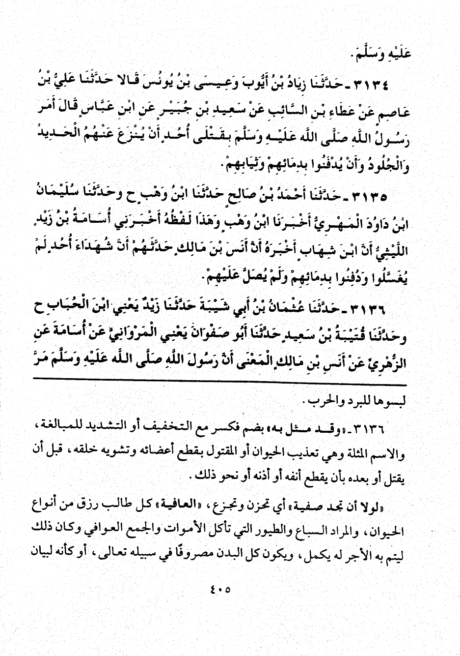 3136 - "وقد مثل به" بضم فكسر مع التخفيف أو التشديد للمبالغة، والاسم المثلة وهي تعذيب الحيوان أو المقتول بقطع أعضائه وتشويه خلقه، قبل أن يقتل أو بعده بأن يقطع أنفه أو أذنه أو نحو ذلك.