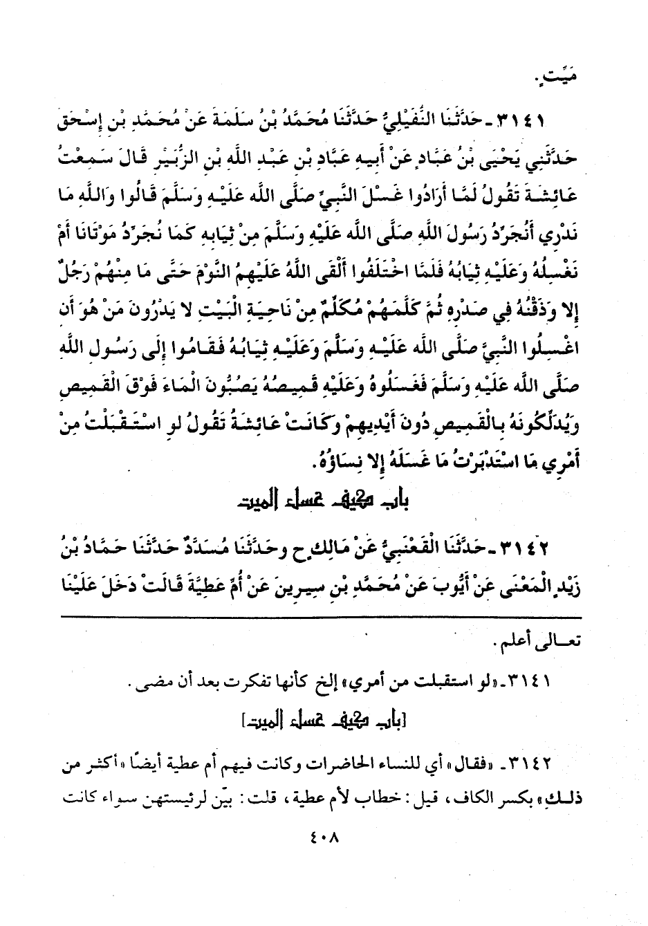 3141 - حَدَّثَنَا النُّفَيْلِيُّ، حَدَّثَنَا مُحَمَّدُ بْنُ سَلَمَةَ، عَنْ مُحَمَّدِ بْنِ إِسْحَاقَ، حَدَّثَنِي يَحْيَى بْنُ عَبَّادٍ، عَنْ أَبِيهِ عَبَّادِ بْنِ عَبْدِ اللَّهِ بْنِ الزُّبَيْرِ قَالَ: سَمِعْتُ عَائِشَةَ، تَقُولُ: لَمَّا أَرَادُوا غَسْلَ النَّبِيِّ صَلَّى اللهُ عَلَيْهِ وَسَلَّمَ قَالُوا: وَاللَّهِ مَا نَدْرِي أَنُجَرِّدُ رَسُولَ اللَّهِ صَلَّى اللهُ عَلَيْهِ وَسَلَّمَ مِنْ ثِيَابِهِ كَمَا نُجَرِّدُ مَوْتَانَا، أَمْ نَغْسِلُهُ وَعَلَيْهِ ثِيَابُهُ؟ فَلَمَّا اخْتَلَفُوا أَلْقَى اللَّهُ عَلَيْهِمُ النَّوْمَ حَتَّى مَا مِنْهُمْ رَجُلٌ إِلَّا وَذَقْنُهُ فِي صَدْرِهِ، ثُمَّ كَلَّمَهُمْ مُكَلِّمٌ مِنْ نَاحِيَةِ الْبَيْتِ لَا يَدْرُونَ مَنْ هُوَ: «أَنْ اغْسِلُوا النَّبِيَّ صَلَّى اللهُ عَلَيْهِ وَسَلَّمَ وَعَلَيْهِ ثِيَابُهُ، فَقَامُوا إِلَى رَسُولِ اللَّهِ صَلَّى اللهُ عَلَيْهِ وَسَلَّمَ فَغَسَلُوهُ وَعَلَيْهِ قَمِيصُهُ، يَصُبُّونَ الْمَاءَ فَوْقَ الْقَمِيصِ وَيُدَلِّكُونَهُ بِالْقَمِيصِ دُونَ أَيْدِيهِمْ»، وَكَانَتْ عَائِشَةُ تَقُولُ: «لَوْ اسْتَقْبَلْتُ مِنْ أَمْرِي مَا اسْتَدْبَرْتُ، مَا غَسَلَهُ إِلَّا نِسَاؤُهُ».