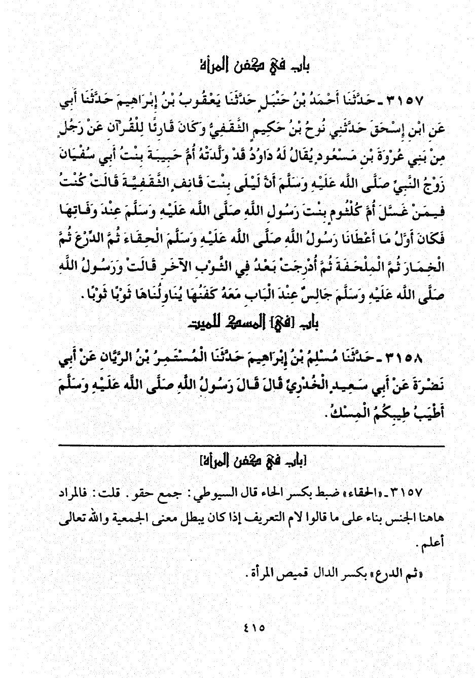 3157 - "الحقاء" ضبط بكسر الحاء قال السيوطي: جمع حقو. قلت: فالمراد هاهنا الجنس بناء على ما قالوا لام التعريف إذا كان يبطل معنى الجمعية والله تعالى أعلم.