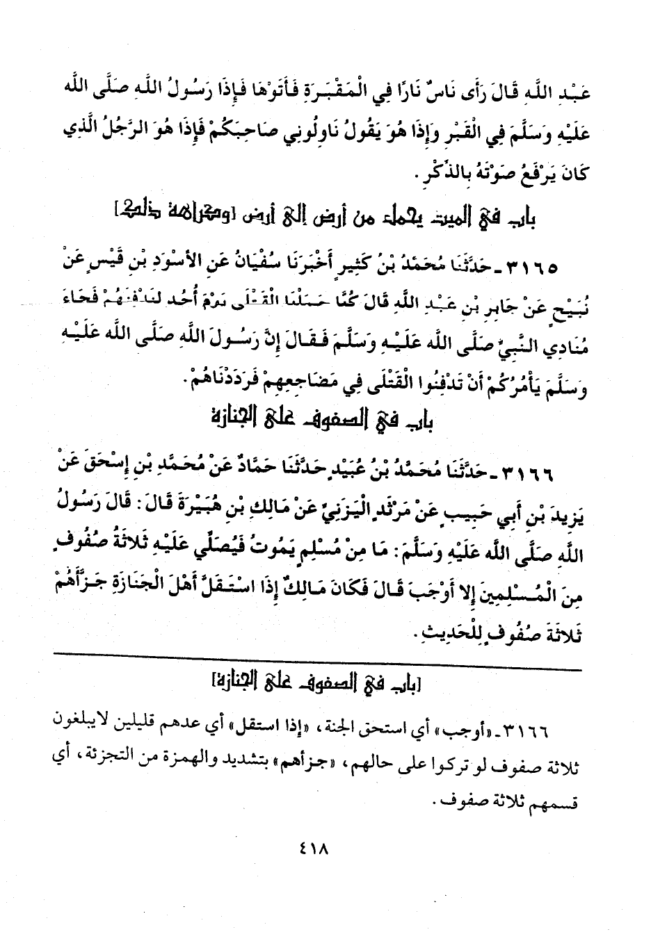 3166 - حَدَّثَنَا مُحَمَّدُ بْنُ عُبَيْدٍ، حَدَّثَنَا حَمَّادٌ، عَنْ مُحَمَّدِ بْنِ إِسْحَاقَ، عَنْ يَزِيدَ بْنِ أَبِي حَبِيبٍ، عَنْ مَرْثَدٍ الْيَزَنِيِّ، عَنْ مَالِكِ بْنِ هُبَيْرَةَ، قَالَ: قَالَ رَسُولُ اللَّهِ صَلَّى اللهُ عَلَيْهِ وَسَلَّمَ: «مَا مِنْ مُسْلِمٍ يَمُوتُ فَيُصَلِّي عَلَيْهِ ثَلَاثَةُ صُفُوفٍ مِنَ الْمُسْلِمِينَ، إِلَّا أَوْجَبَ»، قَالَ: فَكَانَ مَالِكٌ «إِذَا اسْتَقَلَّ أَهْلَ الْجَنَازَةِ جَزَّأَهُمْ ثَلَاثَةَ صُفُوفٍ لِلْحَدِيثِ».