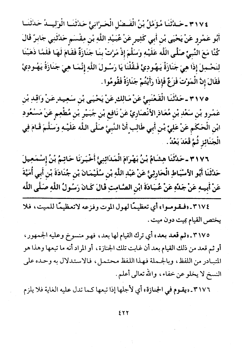 3175 - "ثم قعد بعد" أي ترك القيام لها بعد، فهو منسوخ وعليه الجمهور، أو ثم قعد من ذلك القيام بعد أن غابت تلك الجنازة، أو المراد أنه ما تبعها وهذا هو المتبادر من اللفظ، وبالجملة فهذا اللفظ محتمل، فالاستدلال به وحده على النسخ لا يخلو عن خفاء، والله تعالى أعلم.