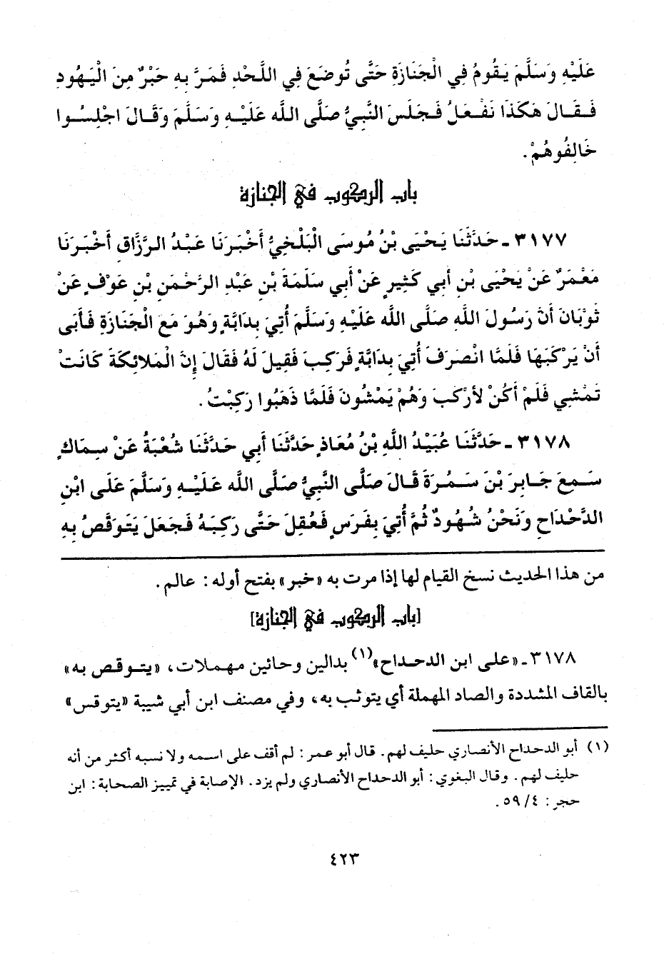 3178 - حَدَّثَنَا عُبَيْدُ اللَّهِ بْنُ مُعَاذٍ، حَدَّثَنَا أَبِي، حَدَّثَنَا شُعْبَةُ، عَنْ سِمَاكٍ، سَمِعَ جَابِرَ بْنَ سَمُرَةَ، قَالَ: «صَلَّى النَّبِيُّ صَلَّى اللهُ عَلَيْهِ وَسَلَّمَ عَلَى ابْنِ الدَّحْدَاحِ وَنَحْنُ شُهُودٌ، ثُمَّ أُتِيَ بِفَرَسٍ فَعُقِلَ حَتَّى رَكِبَهُ، فَجَعَلَ يَتَوَقَّصُ بِهِ