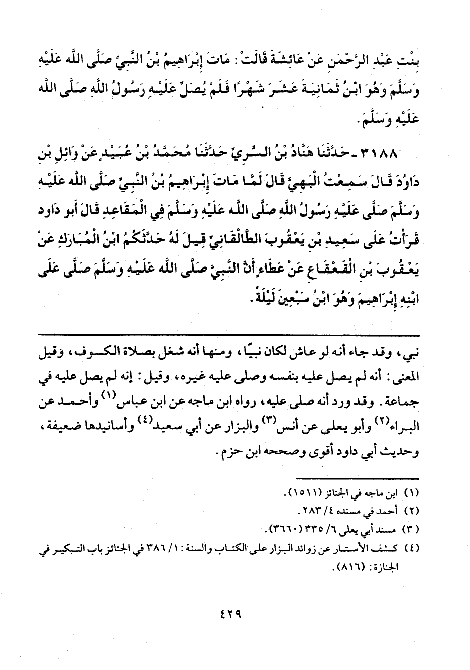 3188 - حَدَّثَنَا هَنَّادُ بْنُ السَّرِيِّ، حَدَّثَنَا مُحَمَّدُ بْنُ عُبَيْدٍ، عَنْ وَائِلِ بْنِ دَاوُدَ، قَالَ: سَمِعْتُ الْبَهِيَّ، قَالَ: «لَمَّا مَاتَ إِبْرَاهِيمُ ابْنُ النَّبِيِّ صَلَّى اللهُ عَلَيْهِ وَسَلَّمَ صَلَّى عَلَيْهِ رَسُولُ اللَّهِ صَلَّى اللهُ عَلَيْهِ وَسَلَّمَ فِي الْمَقَاعِدِ» قَالَ أَبُو دَاوُدَ: قَرَأْتُ عَلَى سَعِيدِ بْنِ يَعْقُوبَ الطَّالْقَانِيِّ، قِيلَ لَهُ: حَدَّثَكُمْ ابْنُ الْمُبَارَكِ، عَنْ يَعْقُوبَ بْنِ الْقَعْقَاعِ، عَنْ عَطَاءٍ، أَنَّ النَّبِيَّ صَلَّى اللهُ عَلَيْهِ وَسَلَّمَ صَلَّى عَلَى ابْنِهِ إِبْرَاهِيمَ وَهُوَ ابْنُ سَبْعِينَ لَيْلَةً.