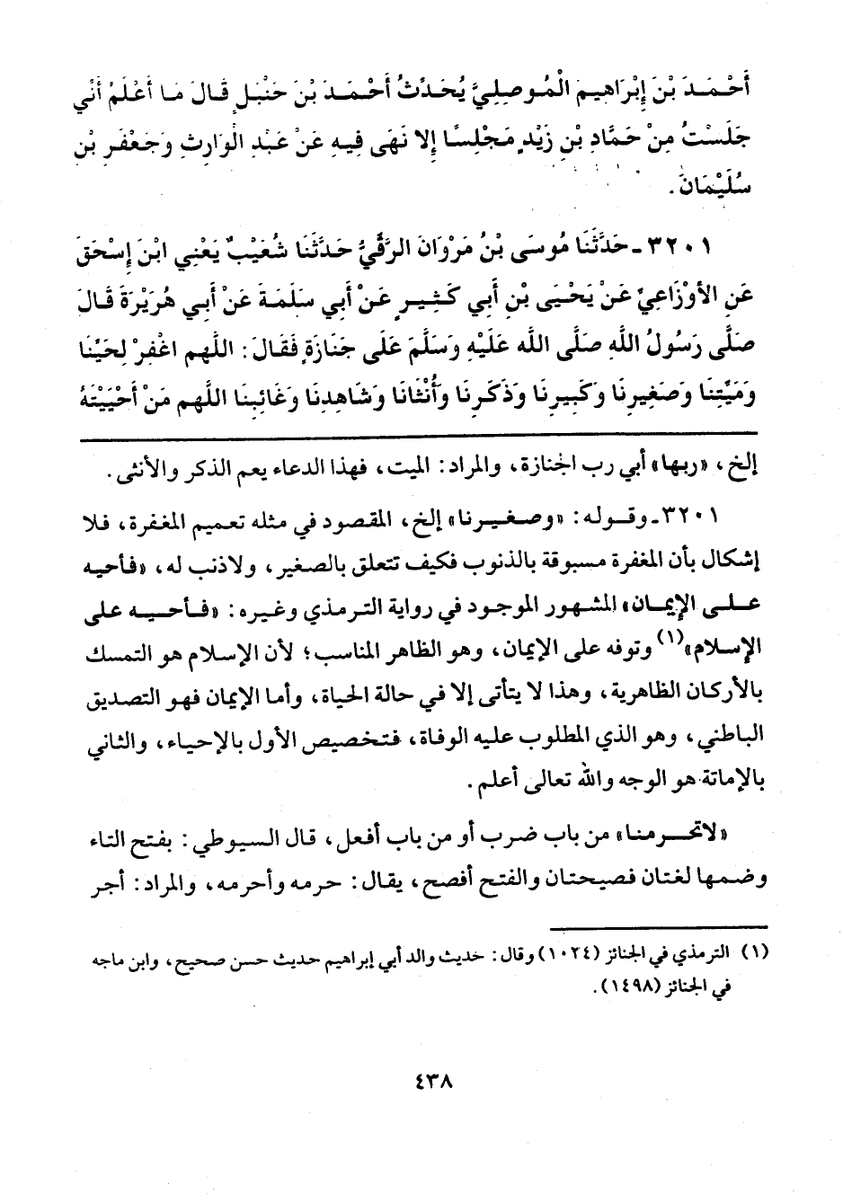 3201 - وقوله: "وصغيرنا" إلخ، المقصود في مثله تعميم المغفرة، فلا إشكال بأن المغفرة مسبوقة بالذنوب فكيف تتعلق بالصغير، ولا ذنب له، "فأحيه على الإيمان" المشهور الموجود في رواية الترمذي وغيره: "فأحيه على الإسلام" (¬1) وتوفه على الإيمان، وهو الظاهر المناسب؛ لأن الإسلام هو التمسك بالأركان الظاهرية، وهذا لا يتأتى إلا في حالة الحياة، وأما الإيمان فهو التصديق الباطني، وهو الذي المطلوب عليه الوفاة، فتخصيص الأول بالإحياء، والثاني بالإماتة. هو الوجه والله تعالى أعلم.
