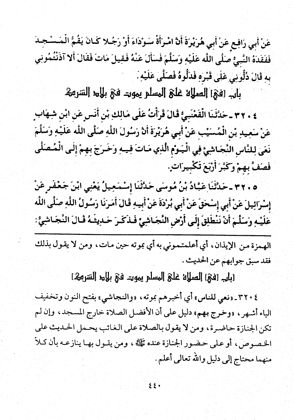 3204 - "نعي للناس" أي أخبرهم بموته، "والنجاشي" بفتح النون وتخفيف الياء أشهر، "وخرج بهم" دليل على أن الأفضل الصلاة خارج المسجد، وإن لم تكن الجنازة حاضرة، ومن لا يقول بالصلاة على الغائب يحمل الحديث على الخصوص، أو على حضور الجنازة عنده - صلى الله عليه وسلم -، ومن يقول بها ينازعه بأن كلًّا منهما محتاج إلى دليل والله تعالى أعلم.