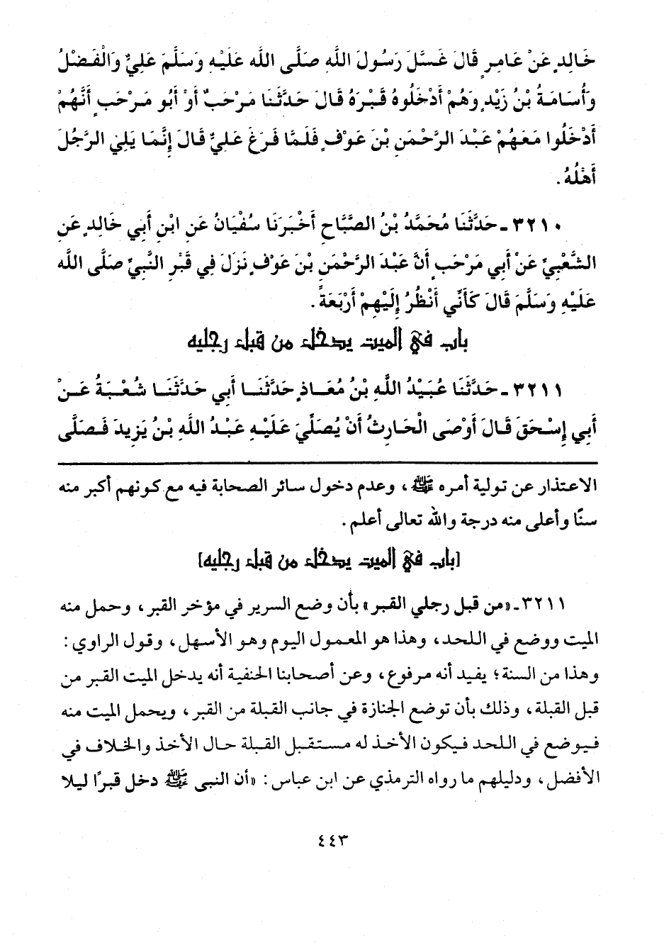 3211 - "من قبل رجلي القبر" بأن وضع السرير في مؤخر القبر، وحمل منه الميت ووضع في اللحد، وهذا هو المعمول اليوم وهو الأسهل، وقول الراوي: وهذا من السنة، يفيد أنه مرفوع، وعن أصحابنا الحنفية أنه يدخل الميت القبر من قبل القبلة، وذلك بأن توضع الجنازة في جانب القبلة من التكبر، ويحمل الميت منه فيوضع في اللحد فيكون الأخذ له مستقبل القبلة حال الأخذ والخلاف في الأفضل، ودليلهم ما رواه الترمذي عن ابن عباس: "أن النبي - صلى الله عليه وسلم - دخل قبرًا ليلا