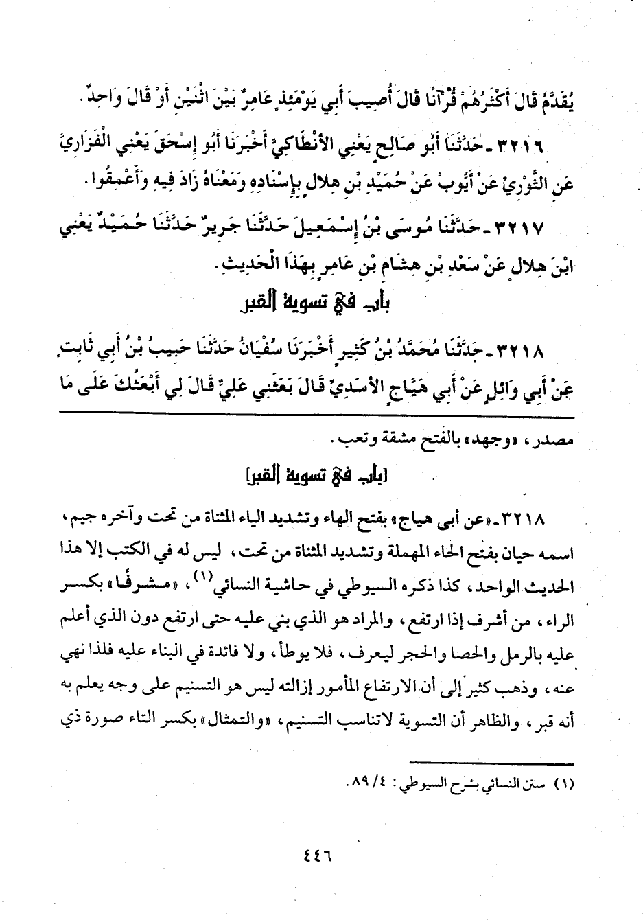3218 - "عن أبي هياج" بفتح الهاء وتشديد الياء المثناة من تحت وآخره جيم، اسمه حيان بفتح الحاء المهملة وتشديد المثناة من تحت، ليس له في الكتب إلا هذا الحديث الواحد، كذا ذكره السيوطي في حاشية النسائي (¬1)، "مشرفًا" بكسر الراء، من أشرف إذا ارتفع، والمراد هو الذي بني عليه حتى ارتفع دون الذي أعلم عليه بالرمل والحصا والحجر لجرف، فلا يوطأ، ولا فائدة في البناء عليه فلذا نهي عنه، وذهب كثير إلى أن الارتفاع المأمور إزالته ليس هو التسنيم على وجه يعلم به أنه قبر، والظاهر أن التسوية لا تناسب التسنيم، "والتمثال" بكسر التاء صورة ذي