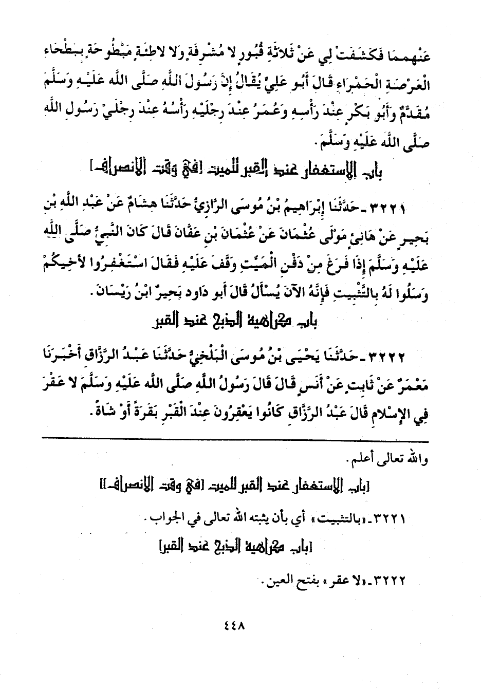 3221 - حَدَّثَنَا إِبْرَاهِيمُ بْنُ مُوسَى الرَّازِيُّ، حَدَّثَنَا هِشَامٌ، عَنْ عَبْدِ اللَّهِ بْنِ بَحِيرٍ، عَنْ هَانِئٍ، مَوْلَى عُثْمَانَ، عَنْ عُثْمَانَ بْنِ عَفَّانَ، قَالَ: كَانَ النَّبِيُّ صَلَّى اللهُ عَلَيْهِ وَسَلَّمَ، إِذَا فَرَغَ مِنْ دَفْنِ الْمَيِّتِ وَقَفَ عَلَيْهِ، فَقَالَ: «اسْتَغْفِرُوا لِأَخِيكُمْ، وَسَلُوا لَهُ بِالتَّثْبِيتِ، فَإِنَّهُ الْآنَ يُسْأَلُ»، قَالَ أَبُو دَاوُدَ: «بَحِيرٌ ابْنُ رَيْسَانَ».