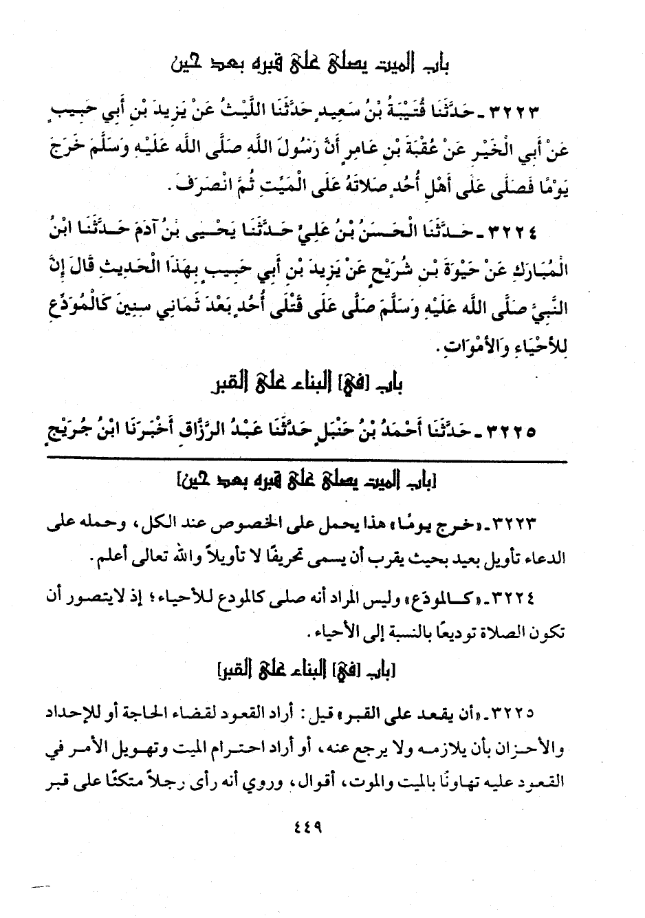 3225 - "أن يقعد على القبر" قيل: أراد القعود لقضاء الحاجة أو للإحداد والأحزان بأن يلازمه ولا يرجع عنه، أو أراد احترام الميت وتهويل الأمر في القعود عليه تهاونًا بالميت والموت، أقوال، وروي أنه رأى رجلًا متكئًا على قبر