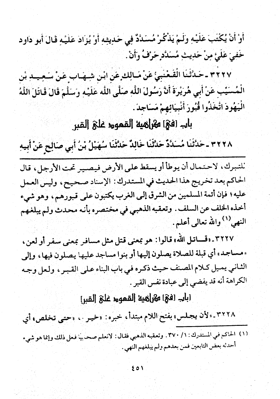 3227 - "قاتل الله" قالوا: هو بمعنى قتل مثل مسافر بمعنى سفر أو لعن، "مساجد" أي قبلة للصلاة يصلون إليها أو بنوا مساجد عليها يصلون فيها، وإلى الثاني يميل كلام المصنف حيث ذكره في باب البناء على القبر، ولعل وجه الكراهة أنه قد يفضي إلى عبادة نفس القبر.