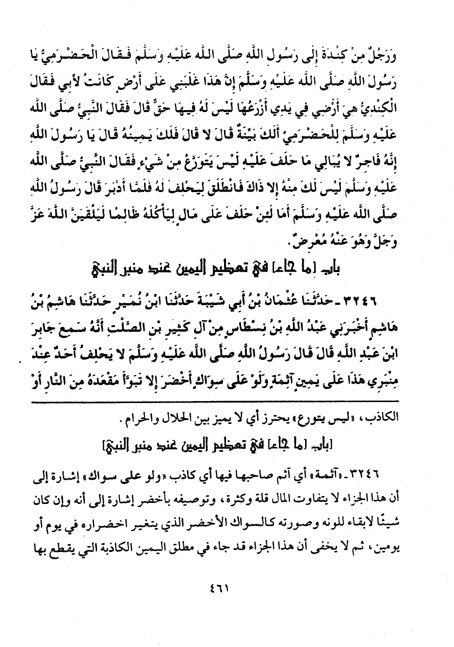 3246 - حَدَّثَنَا عُثْمَانُ بْنُ أَبِي شَيْبَةَ، حَدَّثَنَا ابْنُ نُمَيْرٍ، حَدَّثَنَا هَاشِمُ بْنُ هَاشِمٍ أَخْبَرَنِي عَبْدُ اللَّهِ بْنُ نِسْطَاسٍ، مِنْ آلِ كَثِيرِ بْنِ الصَّلْتِ، أَنَّهُ سَمِعَ جَابِرَ بْنَ عَبْدِ اللَّهِ، قَالَ: قَالَ رَسُولُ اللَّهِ صَلَّى اللهُ عَلَيْهِ وَسَلَّمَ: «لَا يَحْلِفُ أَحَدٌ عِنْدَ مِنْبَرِي هَذَا، عَلَى يَمِينٍ آثِمَةٍ، وَلَوْ عَلَى سِوَاكٍ أَخْضَرَ، إِلَّا تَبَوَّأَ مَقْعَدَهُ مِنَ النَّارِ - أَوْ