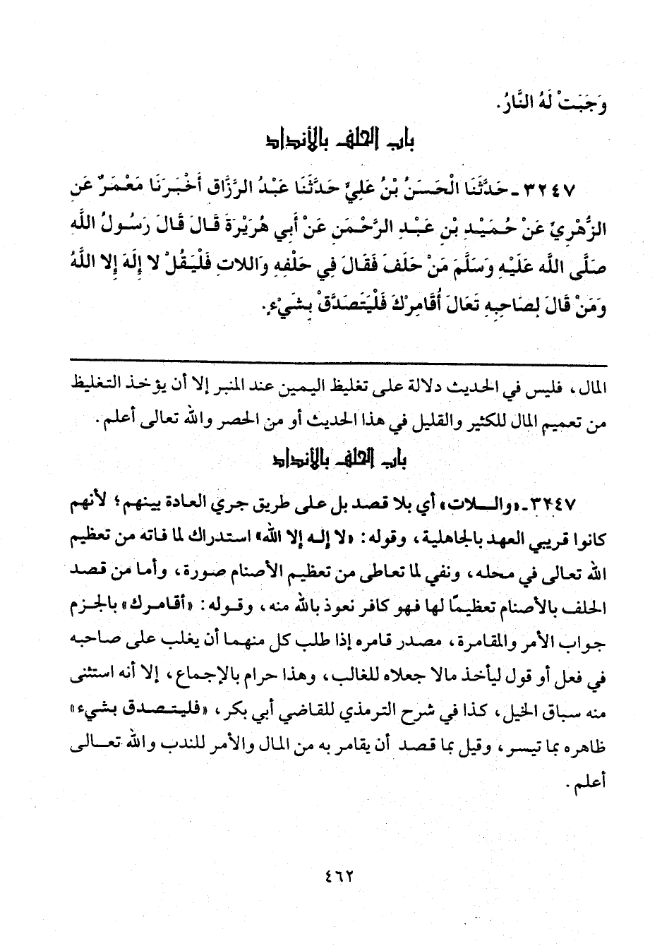 3247 - "واللات" أي بلا قصد بل على طريق جري العادة بينهم؛ لأنهم كانوا قريبي العهد بالجاهلية، وقوله: "لا إله إلا الله" استدراك لما فاته من تعظيم الله تعالى في محله، ونفي لما تعاطى من تعظيم الأصنام صورة، وأما من قصد الحلف بالأصنام تعظيمًا لها فهو كافر نعوذ بالله منه، وقوله: "أقامرك" بالجزم جواب الأمر والمقامرة، مصدر قامره إذا طلب كل منهما أن يغلب على صاحبه في فعل أو قول ليأخذ مالا جعلاه للغالب، وهذا حرام بالإجماع، إلا أنه استثنى منه سباق الخيل، كذا في شرح الترمذي للقاضي أبي بكر، "فيلتصدق بشيء" ظاهره بما تيسر، وقيل بما قصد أن يقامر به من المال والأمر للندب والله. تعالى أعلم.
