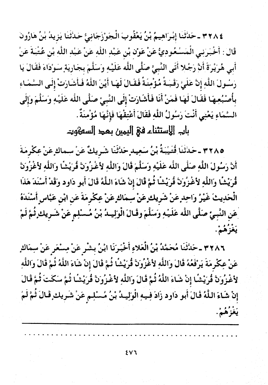 3286 - حَدَّثَنَا مُحَمَّدُ بْنُ الْعَلَاءِ، أَخْبَرَنَا ابْنُ بِشْرٍ، عَنْ مِسْعَرٍ، عَنْ سِمَاكٍ، عَنْ عِكْرِمَةَ، يَرْفَعُهُ، قَالَ: «وَاللَّهِ لَأَغْزُوَنَّ قُرَيْشًا»، ثُمَّ قَالَ: «إِنْ شَاءَ اللَّهُ» ثُمَّ قَالَ: «وَاللَّهِ لَأَغْزُوَنَّ قُرَيْشًا إِنْ شَاءَ اللَّهُ»، ثُمَّ قَالَ: «وَاللَّهِ لَأَغْزُوَنَّ قُرَيْشًا» ثُمَّ سَكَتَ، ثُمَّ قَالَ: «إِنْ شَاءَ اللَّهُ»، قَالَ أَبُو دَاوُدَ: زَادَ فِيهِ الْوَلِيدُ بْنُ مُسْلِمٍ، عَنْ شَرِيكٍ قَالَ: «ثُمَّ لَمْ يَغْزُهُمْ».