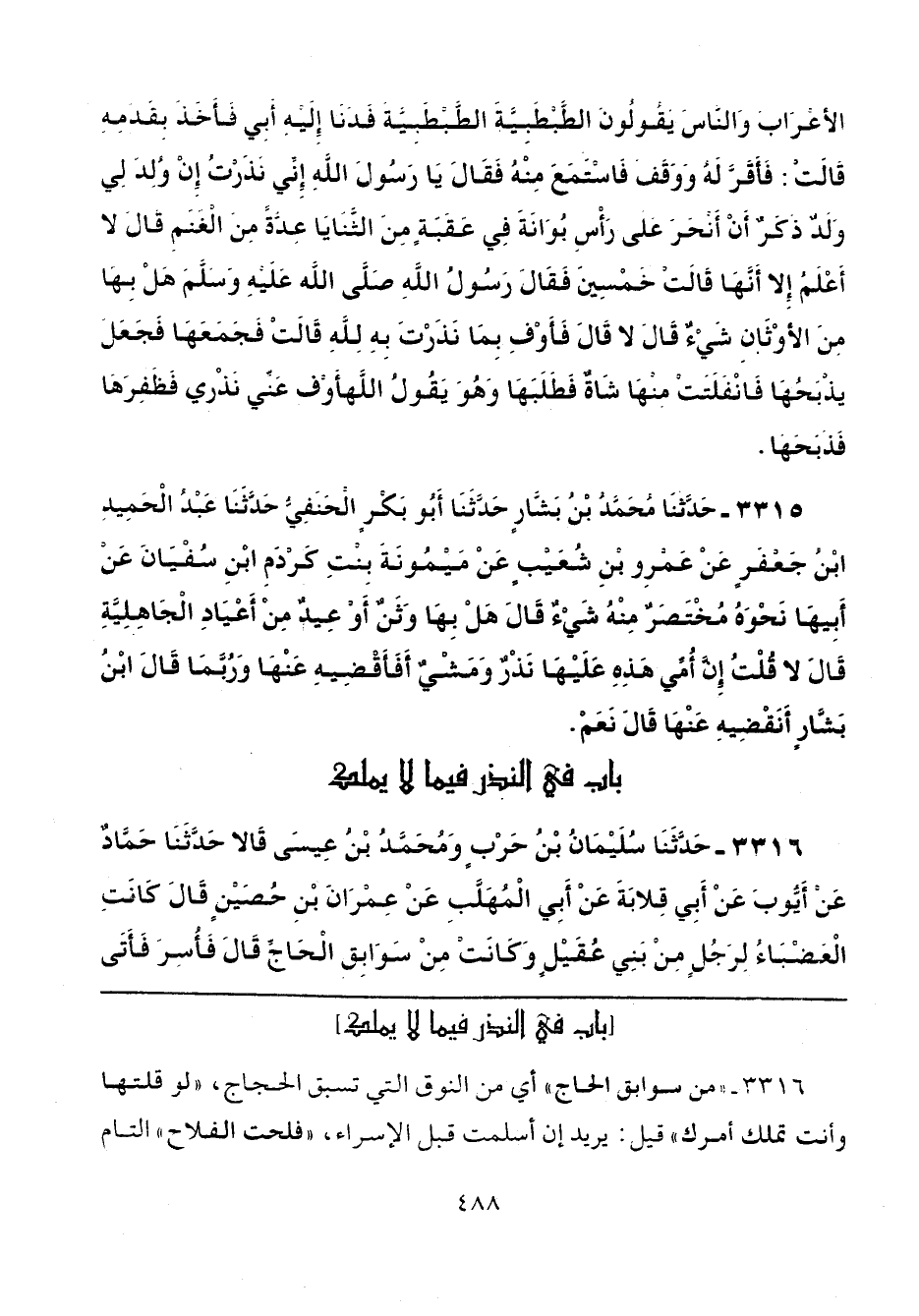 3315 - حَدَّثَنَا مُحَمَّدُ بْنُ بَشَّارٍ، حَدَّثَنَا أَبُو بَكْرٍ الْحَنَفِيُّ، حَدَّثَنَا عَبْدُ الْحَمِيدِ بْنُ جَعْفَرٍ، عَنْ عَمْرِو بْنِ شُعَيْبٍ، عَنْ مَيْمُونَةَ بِنْتِ كَرْدَمِ بْنِ سُفْيَانَ، عَنْ أَبِيهَا نَحْوَهُ مُخْتَصَرٌ مِنْهُ شَيْءٌ، قَالَ: «هَلْ بِهَا وَثَنٌ، أَوْ عِيدٌ مِنْ أَعْيَادِ الْجَاهِلِيَّةِ؟ » قَالَ: لَا، قُلْتُ: إِنَّ أُمِّي هَذِهِ عَلَيْهَا نَذْرٌ، وَمَشْيٌ أَفَأَقْضِيهِ عَنْهَا، وَرُبَّمَا، قَالَ ابْنُ بَشَّارٍ، أَنَقْضِيهِ عَنْهَا، قَالَ: «نَعَمْ».
