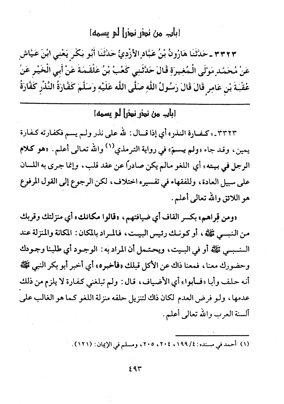 3323 - "كفارة النذر" أي إذا قال: لله على نذر ولم يسم فكفارته كفارة يمين، وقد جاء "ولم يسمّ" في رواية الترمذي (¬1) والله تعالى أعلم. "هو كلام الرجل في بيته" أي اللغو ما لم يكن صادرًا عن عقد قلب، وإنما جرى به اللسان على سبيل العادة، وللفقهاء في تفسيره اختلاف، لكن الرجوع إلى القول المرفوع هو اللائق والله تعالى أعلم.