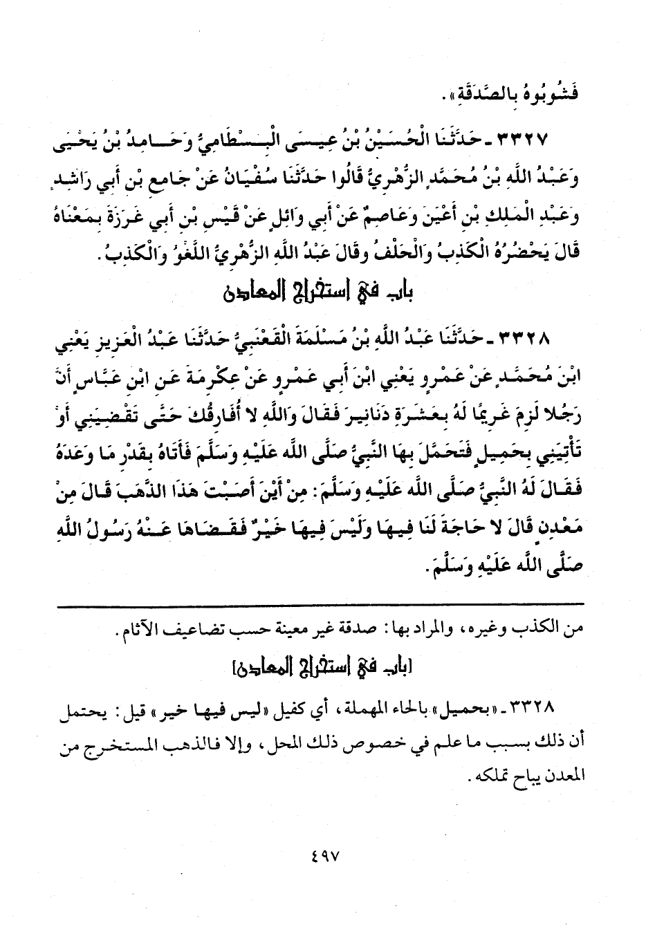 3328 - "بحميل" بالحاء المهملة، أي كفيل "ليس فيها خير" قيل: يحتمل أن ذلك بسبب ما علم في خصوص ذلك المحل، وإلا فالذهب المستخرج من المعدن يباح تملكه.