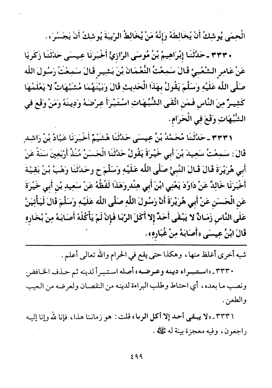 3330 - حَدَّثَنَا إِبْرَاهِيمُ بْنُ مُوسَى الرَّازِيُّ، أَخْبَرَنَا عِيسَى، حَدَّثَنَا زَكَرِيَّا، عَنْ عَامِرٍ الشَّعْبِيِّ، قَالَ: سَمِعْتُ النُّعْمَانَ بْنَ بَشِيرٍ، قَالَ: سَمِعْتُ رَسُولَ اللَّهِ صَلَّى اللهُ عَلَيْهِ وَسَلَّمَ يَقُولُ: بِهَذَا الْحَدِيثِ قَالَ: «وَبَيْنَهُمَا مُشَبَّهَاتٌ لَا يَعْلَمُهَا كَثِيرٌ مِنَ النَّاسِ، فَمَنِ اتَّقَى الشُّبُهَاتِ اسْتَبْرَأَ عِرْضَهُ وَدِينَهُ، وَمَنْ وَقَعَ فِي الشُّبُهَاتِ وَقَعَ فِي الْحَرَامِ».