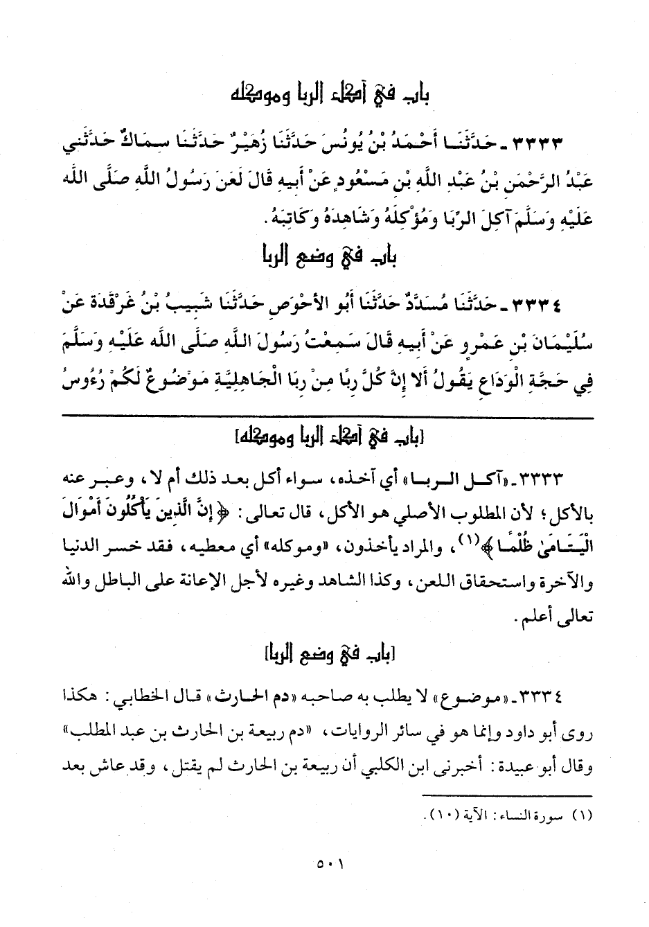 3333 - "آكل الربا" أي آخذه، سواء أكل بعد ذلك أم لا، وعبر عنه بالأكلِ؛ لأن المطلوب الأصلي هو الأكل، قال تعالى: {إِنَّ الَّذِينَ يَأْكُلُونَ أَمْوَال الْيَتَامَى ظُلْمًا} (¬1)، والمراد يأخذون، "وموكله" أي معطيه، فقد خسر الدنيا والآخرة واستحقاق اللعن، وكذا الشاهد وغيره لأجل الإعانة على الباطل والله تعالى أعلم.