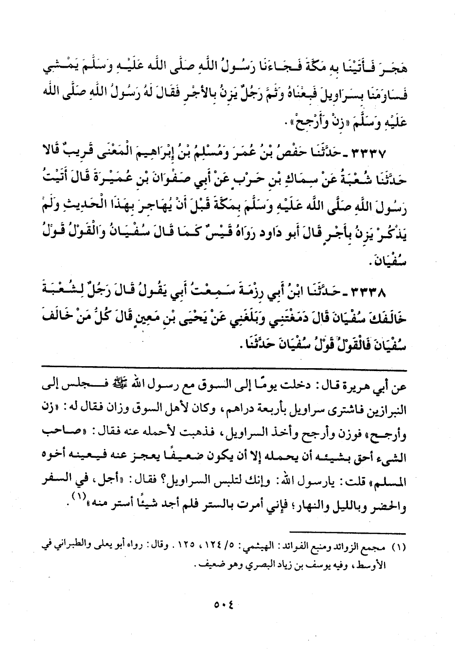 عن أبي هريرة قال: دخلت يومًا إلى السوق مع رسول الله - صلى الله عليه وسلم - فجلس إلى النبرازين فاشترى سراويل بأربعة دراهم، وكان لأهل السوق وزان فقال له: "زن وأرجح" فوزن وأرجح وأخذ السراويل، فذهبت لأحمله عه فقال: "صاحب الشيء أحق بشيئه أن يحمله إِلا أن يكون ضعيفًا يعجز عنه فيعينه أخوه المسلم" قلت: يا رسول الله: وإنك لتلبس السراويل؟ فقال: "أجل، في السفر والحضر وبالليل والنهار، فإِني أمرت بالستر فلم أجد شيئًا أستر منه" (¬1).