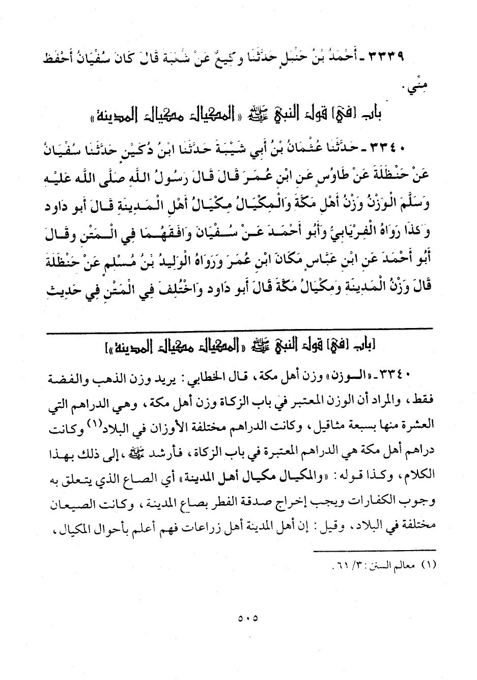 3340 - "الوزن" وزن أهل مكة، قال الخطابي: يريد وزن الذهب والفضة فقط، والمراد أن الوزن المعتبر في باب الزكاة وزن أهل مكة، وهي الدراهم التي العشرة منها بسبعة مثاقيل، وكانت الدراهم مختلفة الأوزان في البلاد (¬1) وكانت دراهم أهل مكة في الدراهم المعتبرة في باب الزكاة، فأرشد - صلى الله عليه وسلم -، إلى ذلك بهذا الكلام، وكذا قوله: "والمكيال مكيال أهل المدينة" أي الصاع الذي يتعلق به وجوب الكفارات ويجب إخراج صدقة الفطر بصاع المدينة، وكانت الصيعان مختلفة في البلاد، وقيل: إن أهل المدينة أهل زراعات فهم أعلم بأحوال المكيال،