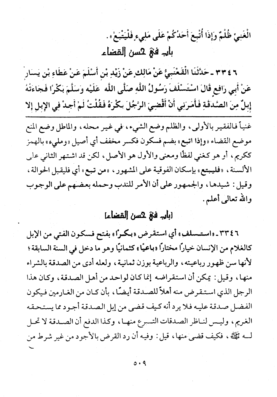 3346 - "استسلف" أي استقرض "بكرًا" بفتح فسكون الفتي من الإبل كالغلام من الإنسان خيارًا مختارًا "باعيًا" كثمانيًا وهو ما دخل في السنة السابقة؛ لأنها سن ظهور رباعيته، والرباعية بوزن ثمانية، ولعله أدى من الصدقة بالشراء منها، وقيل: يمكن أن استقراضه إنما كان لواحد من أهل الصدقة، وكان هذا الرجل الذي استقرض منه أهلًا للصدقة أيضًا، بأن كان من الغارمين فيكون الفضل صدقة عليه فلا يرد أنه كيف قضى من إبل الصدقة أجود مما يستحقه الغريم، وليس لناظر الصدقات التسرع منها، وكذا الدفع أن الصدقة لا تحل له - صلى الله عليه وسلم -، فكيف قضى منها، قيل: وفيه أن رد القرض بالأجود من غير شرط من